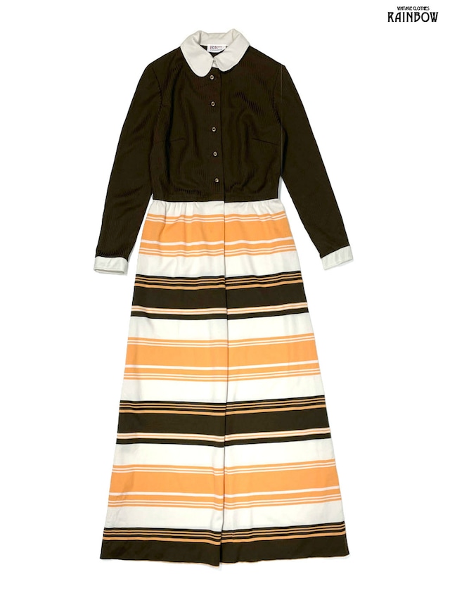 古着 R&K Knits ボーダー柄 ロング丈 長袖 ワンピース 茶 (otu2601028)