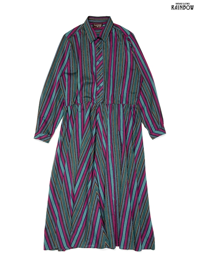 古着 EJM ストライプ柄 コットン ロング丈 長袖 ワンピース 緑 (otu2601030)
