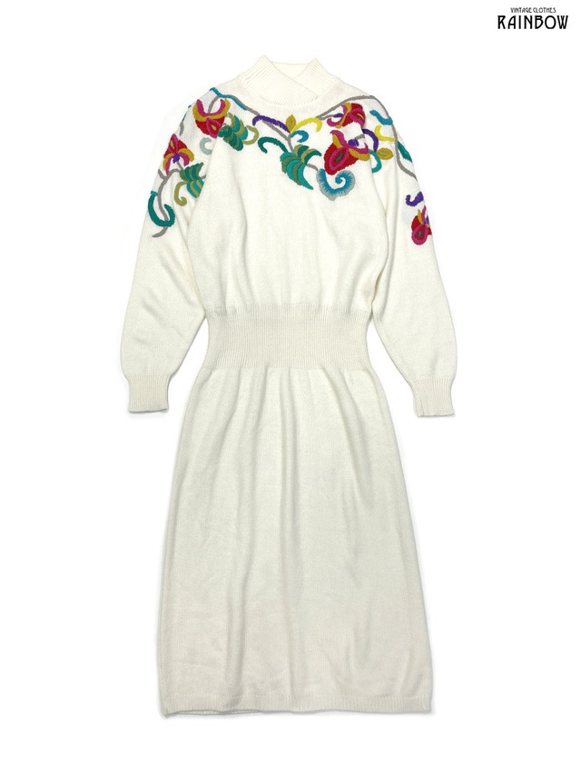 古着 Darian 花柄刺繍 無地 ロング丈 長袖 ニット ワンピース 白 生成り (otu2510012)