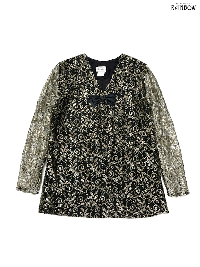 古着 Barone アメリカ製 リボン レース 前開き 総柄 長袖 ブラウス 黒 ゴールド (ttu2510090)