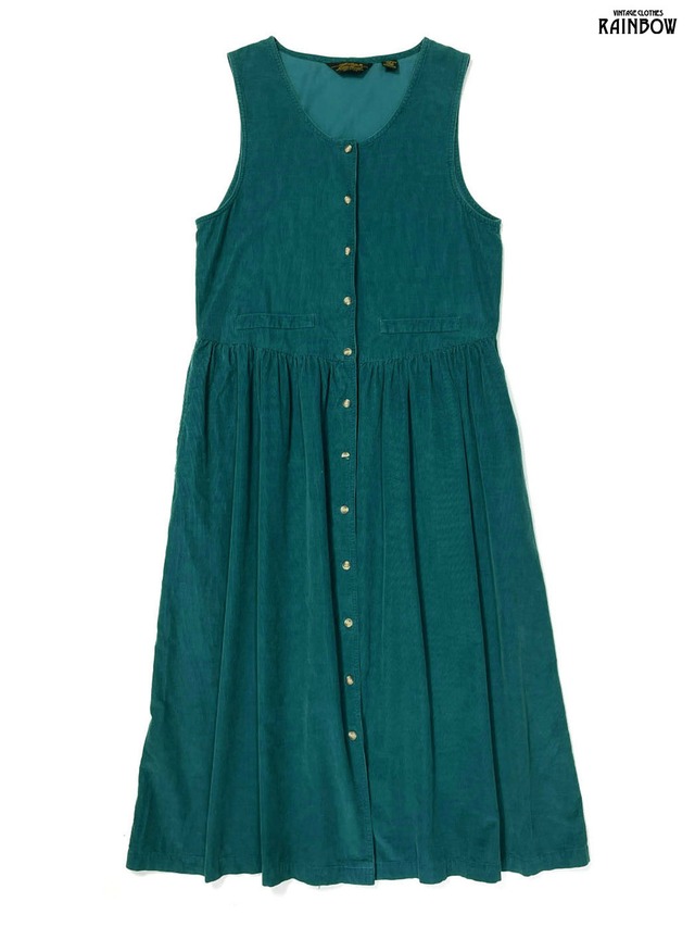 古着 Eddie Bauer エディーバウアー 前開き 無地 コーデュロイ ロング丈 ノースリーブ ワンピース 緑 (otu2508082)