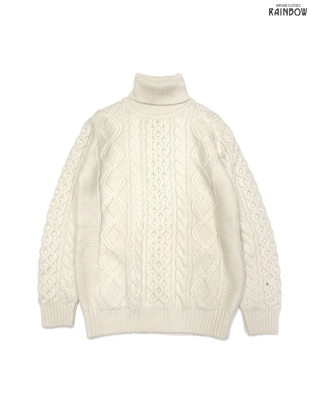 古着 MACY'S ハイネック 無地 ウール100% 長袖 アラン ニット セーター 白 生成り (ttu2512025)