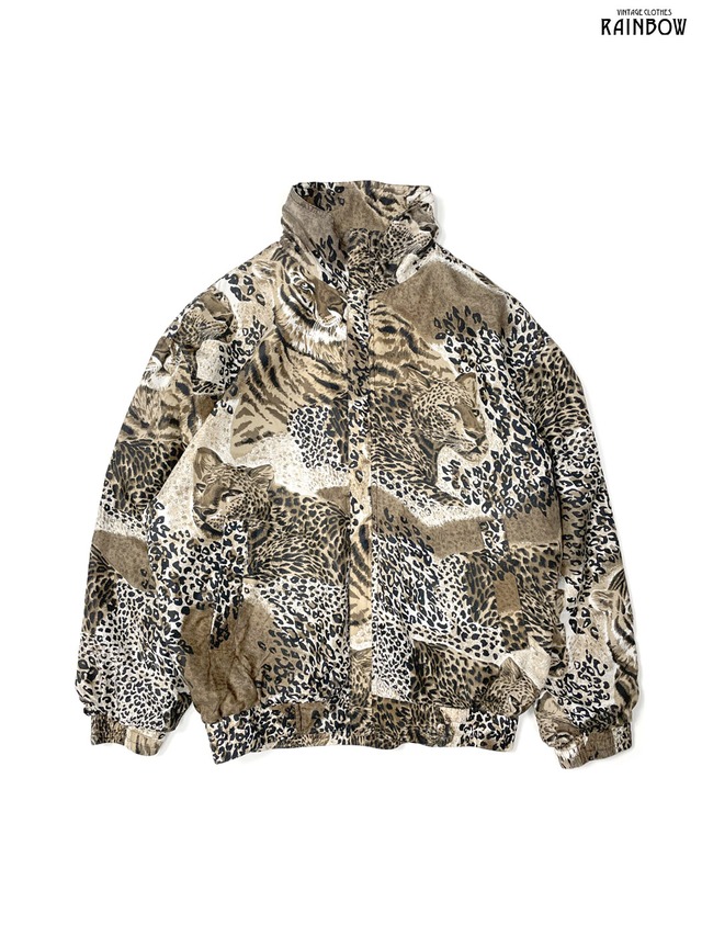 古着 FUDA SILK 豹 前開き ハイネック 総柄 レオパード柄 アニマル シルク100% 長袖 アウター ライトジャケット ベージュ 黒 (ttu2510156)