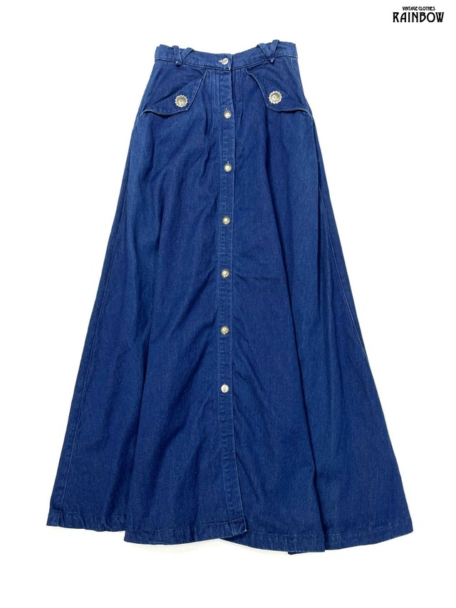 古着 LONGHORN ロングホーン アメリカ製 前開き 無地 デニム ロング丈 スカート 紺 (btu2601102)