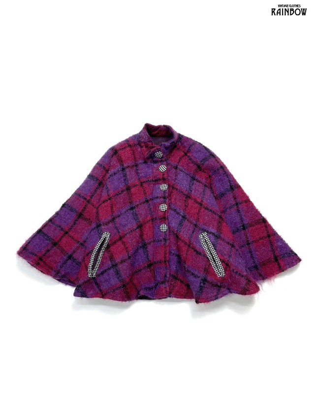 古着 チェック柄 ウール 長袖 アウター 羽織り ポンチョ ピンク 紫 (ttu2511040)