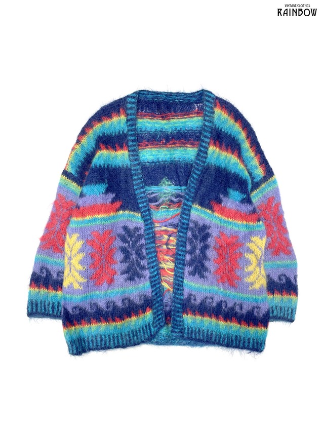 ■商品説明 ■表地 表示なし。モヘアのような素材です。 ■裏地 裏地なし。 ■表示サイズ 表示なし。 ■着脱方法 羽織りタイプです。(前留めはございません。) ■ポケット ポケット無し ■コンディション 【コンディション:B】裏側にほつれ、所々編み目の荒い部分がございます。 ■実寸サイズ 身幅65cm 肩幅75cm 袖丈46cm 着丈80cm ■ブランド ■キーワード #アウター #羽織り #ロングスリーブ #青 #紫 #水色 #総柄 #前開き #ヴィンテージ #ニット地 #柄羽織り