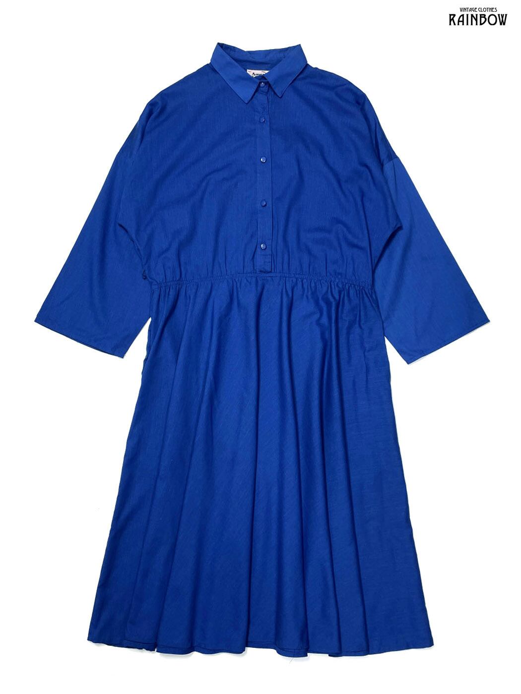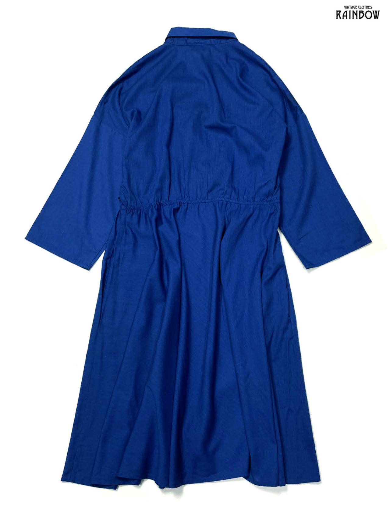 #ワンピース #ロングスリーブ #ロング丈 #ウエスト切り替え #青 #無地 #アメリカ製 #シンプル #コットン #長袖無地ワンピース