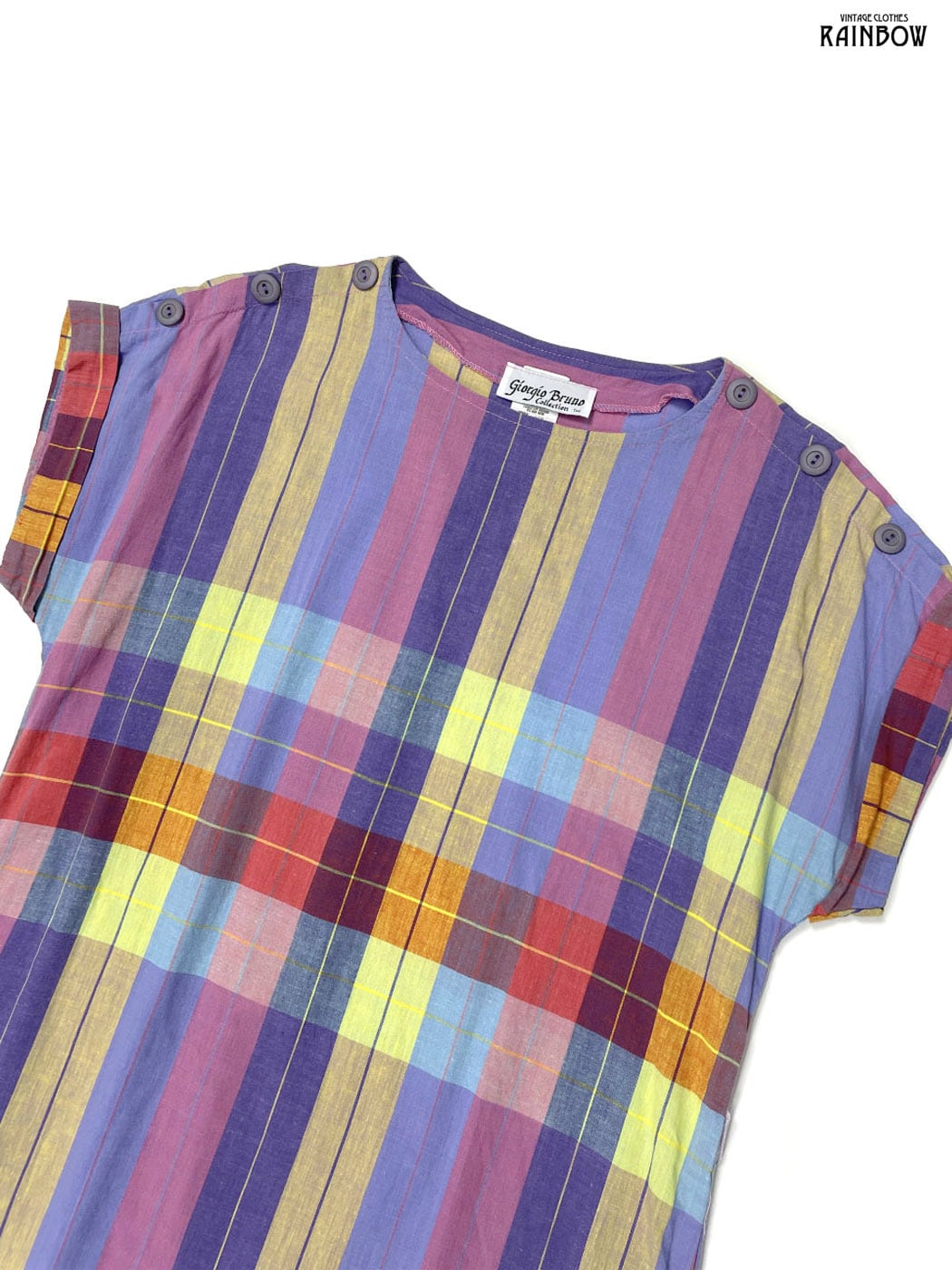 #ワンピース #ハーフスリーブ #ロング丈 #紫 #チェック柄 #コットン #半袖チェック柄ワンピース