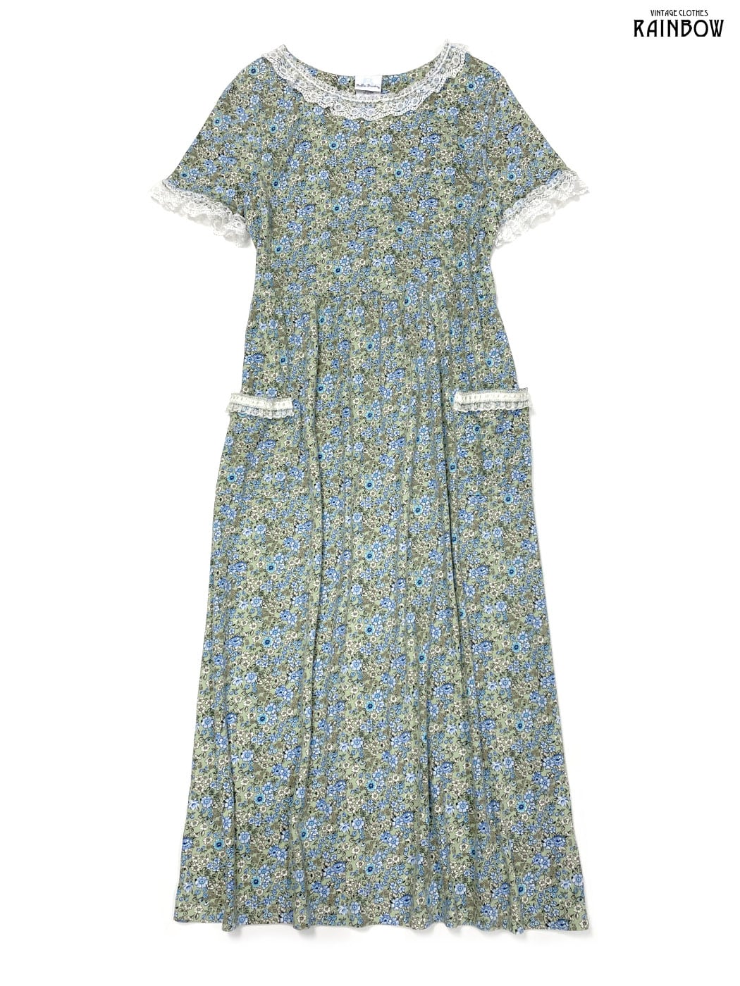 #ワンピース #ハーフスリーブ #ロング丈 #フレア #緑 #花柄 #フリル #レース #ガーリー #コットン #半袖花柄ワンピース