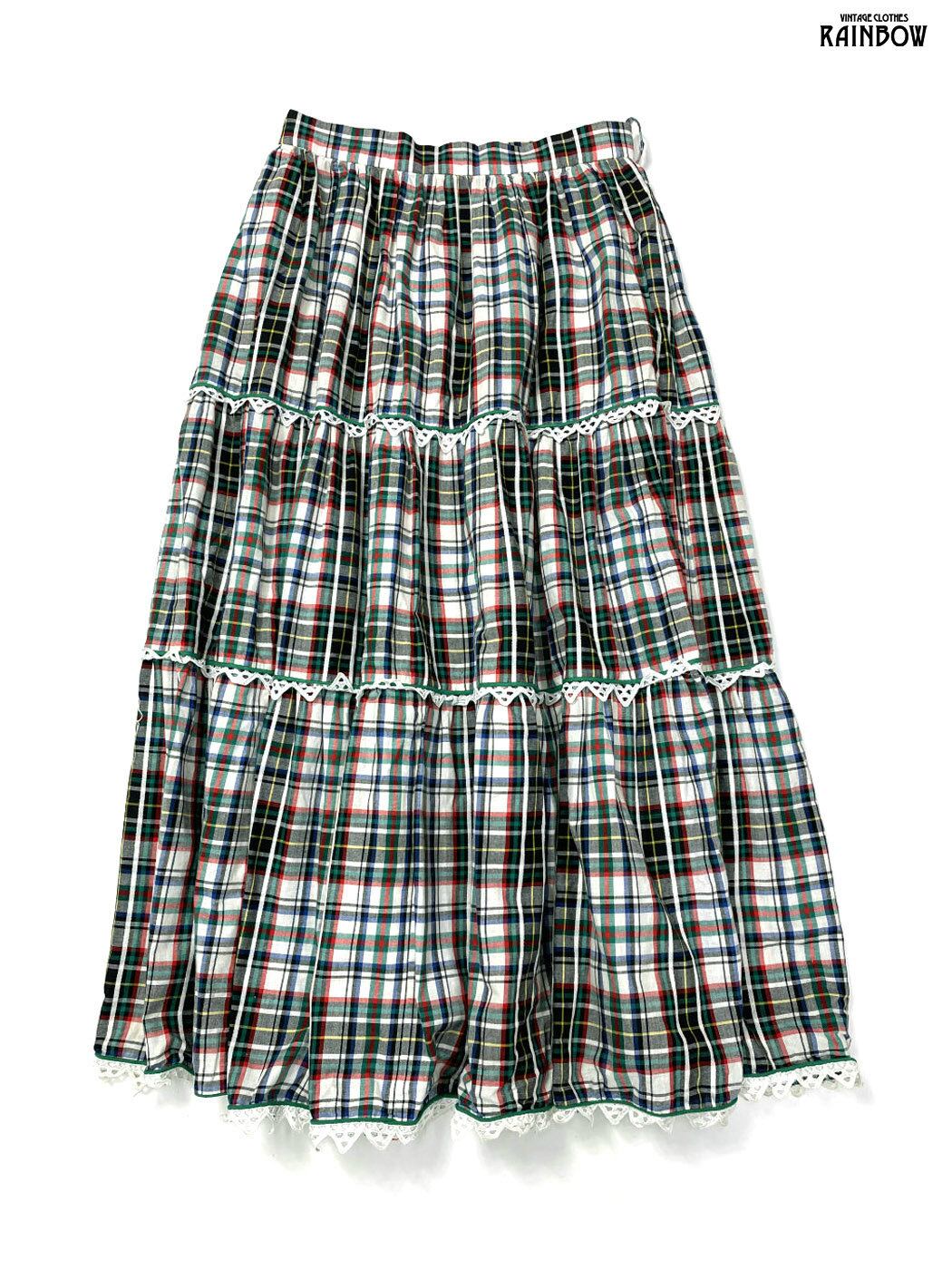 古着 ドイツ製 レース チェック柄 コットン100% ロング丈 ティアード スカート 緑 (btu2504018)