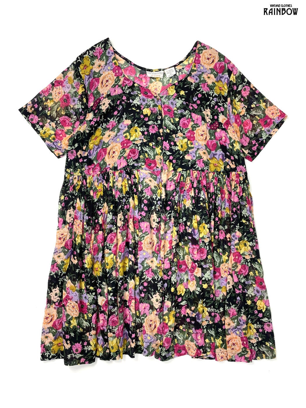 #ワンピース #ハーフスリーブ #膝丈 #ウエスト切り替え #黒 #ピンク #花柄 #前開き #クラシック #コットン #半袖花柄ワンピース