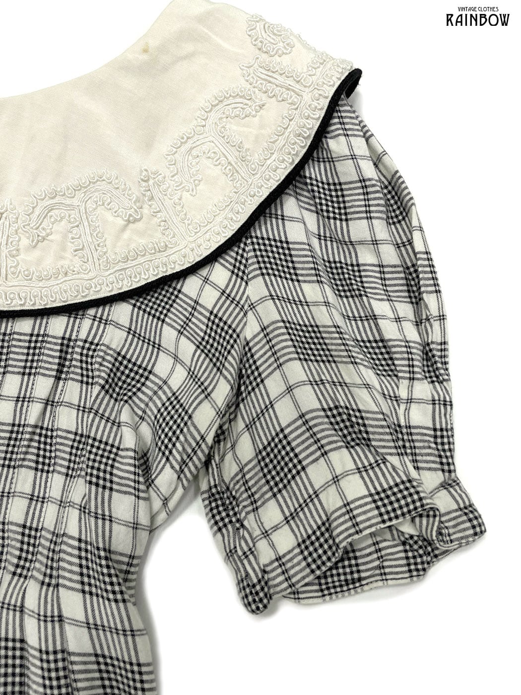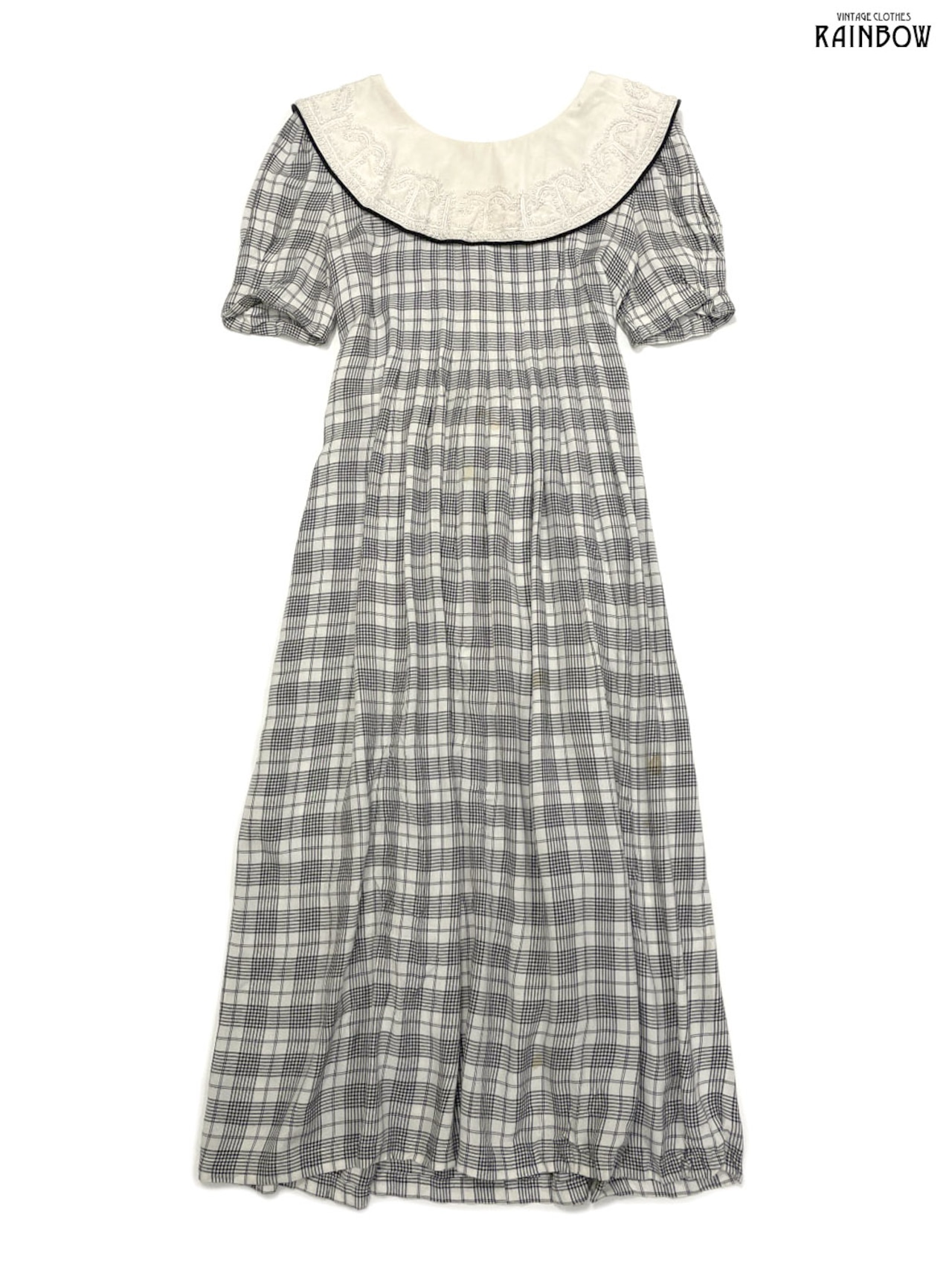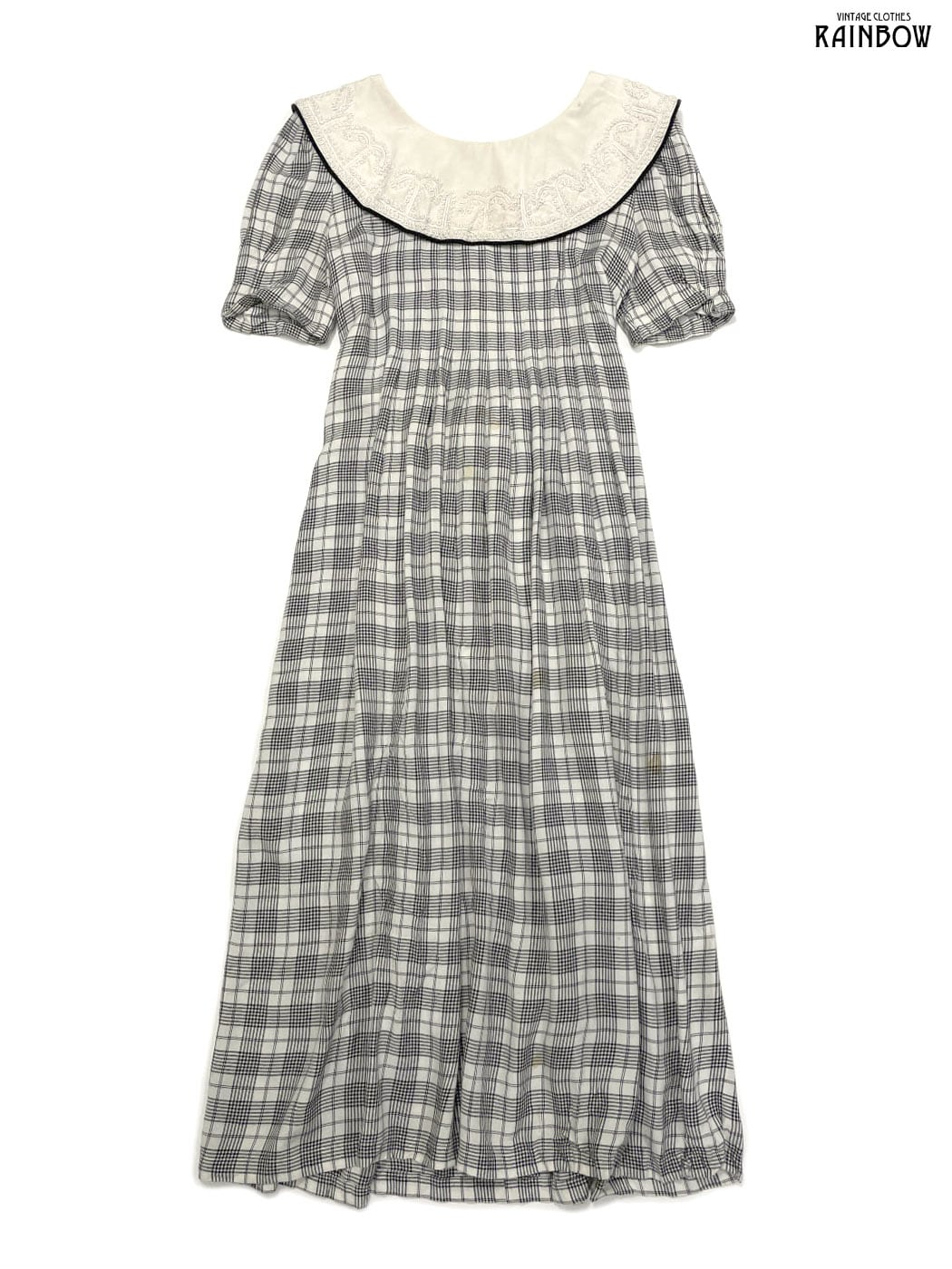 #ワンピース #ハーフスリーブ #ロング丈 #フレア #ベージュ #チェック柄 #刺繍 #リボン #ビッグカラー #パール #ガーリー #レーヨン #刺繍ワンピース