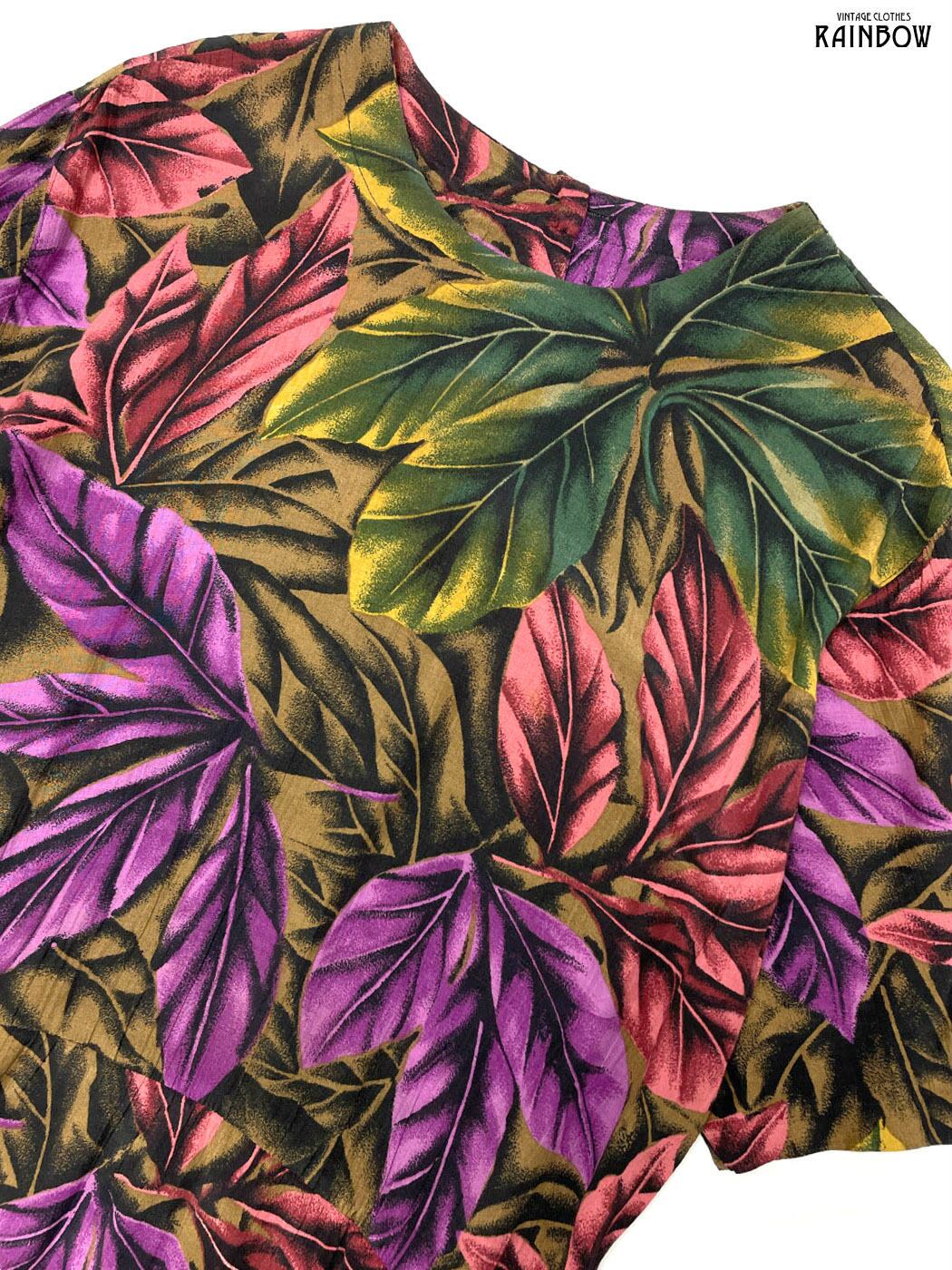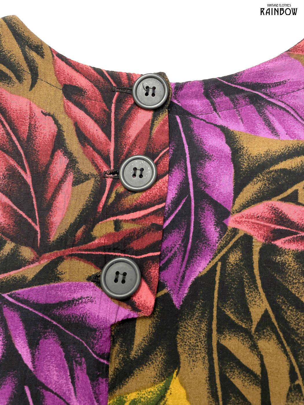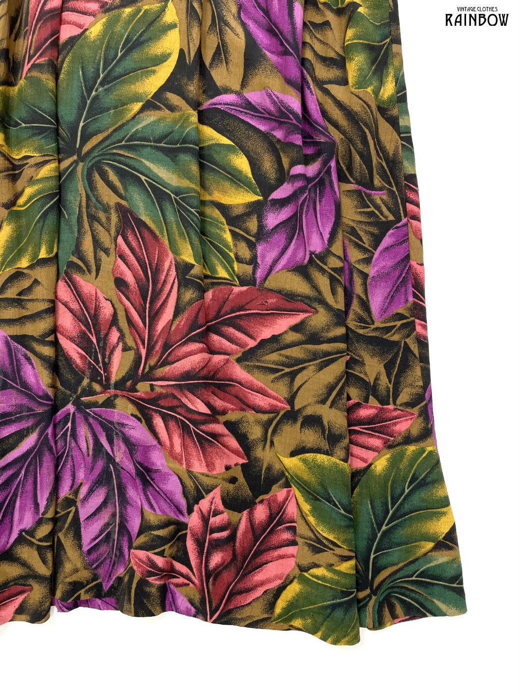 #ワンピース #ハーフスリーブ #ロング丈 #フレア #ウエスト切り替え #茶 #紫 #総柄 #リーフ柄 #クラシック #レーヨン #半袖総柄ワンピース