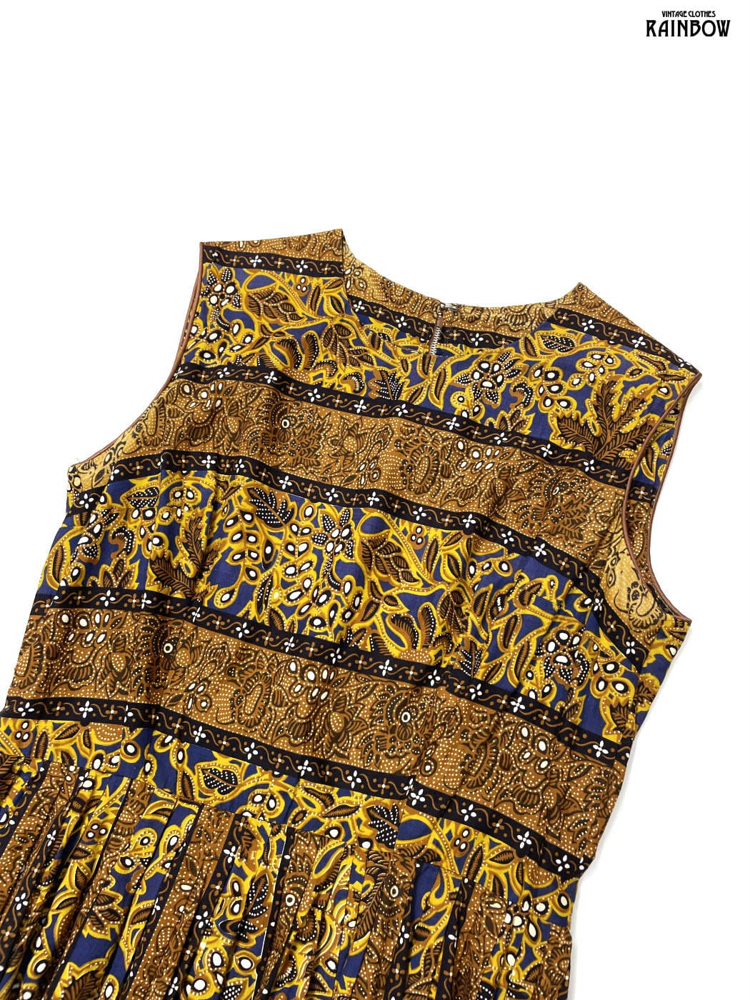 #ワンピース #ノースリーブ #膝丈 #ウエスト切り替え #茶 #総柄 #クラシック #コットン #ノースリーブ総柄ワンピース