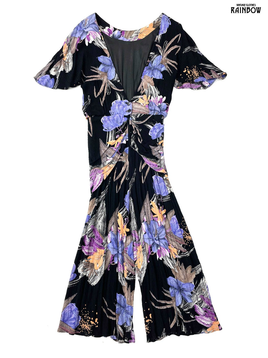 #ワンピース #オールインワン #ハーフスリーブ #ロング丈 #ウエスト切り替え #シワ加工 #黒 #紫 #花柄 #アメリカ製 #クラシック #レーヨン #半袖オールインワン