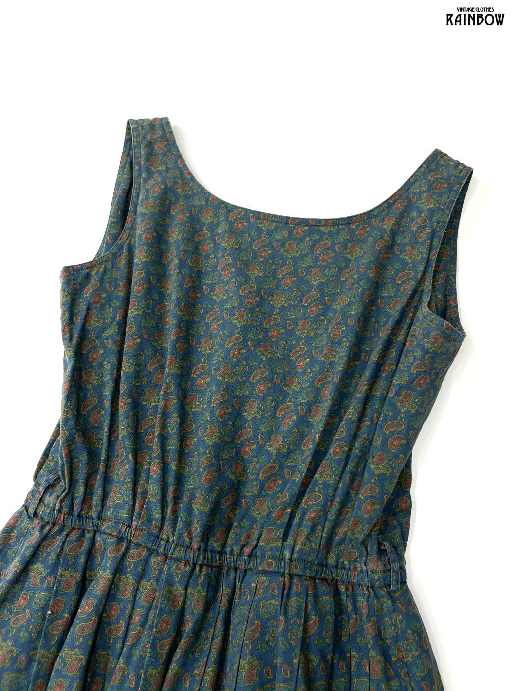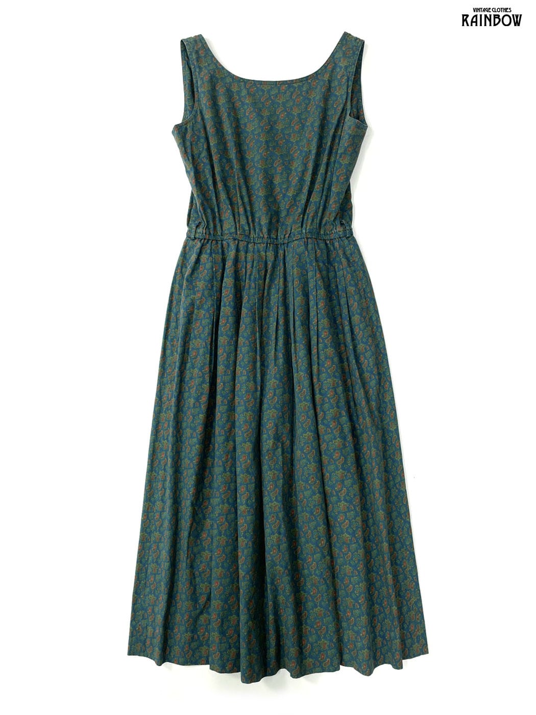 #ワンピース #ノースリーブ #ロング丈 #ウエスト切り替え #緑 #紺 #総柄 #ペイズリー柄 #クラシック #コットン #ノースリーブ総柄ワンピース