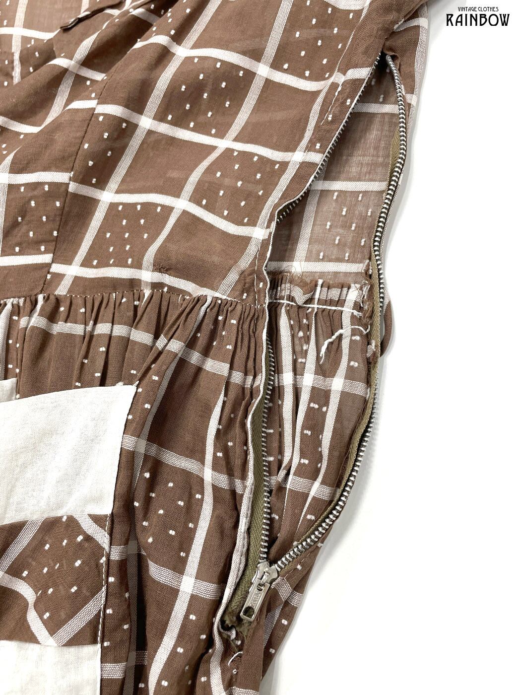 #ワンピース #ハーフスリーブ #ロング丈 #フレア #ウエスト切り替え #茶 #チェック柄 #ビジュー #フレンチスリーブ #クラシック #リネン #リネンワンピース