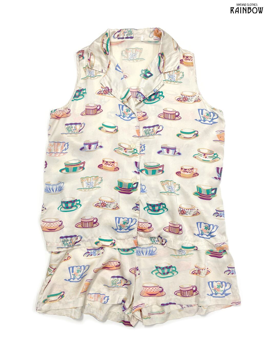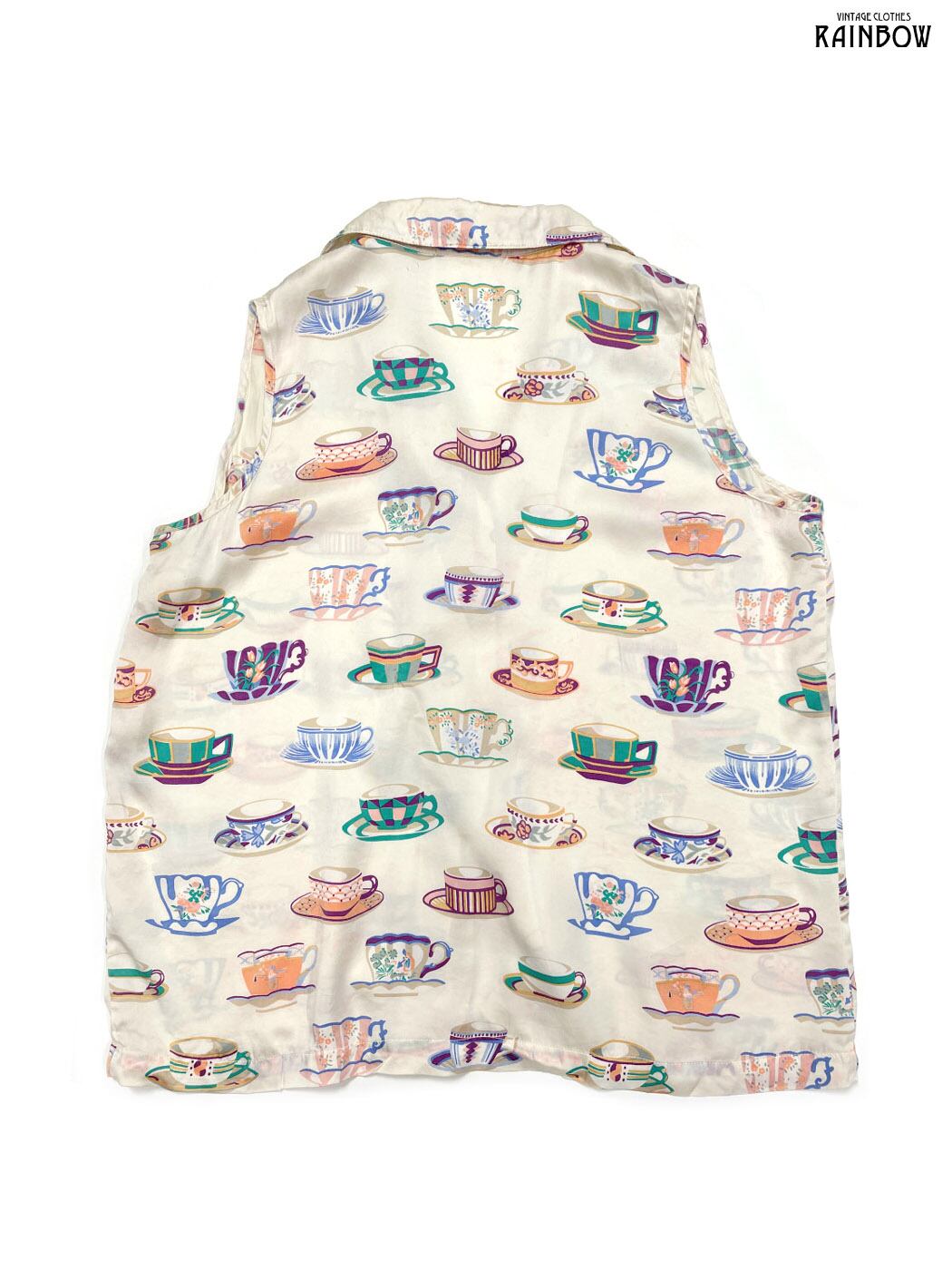#ワンピース #セットアップ #ノースリーブ #ミニ丈 #ベージュ #総柄 #ティーカップ柄 #前開き #ガーリー #セットアップ