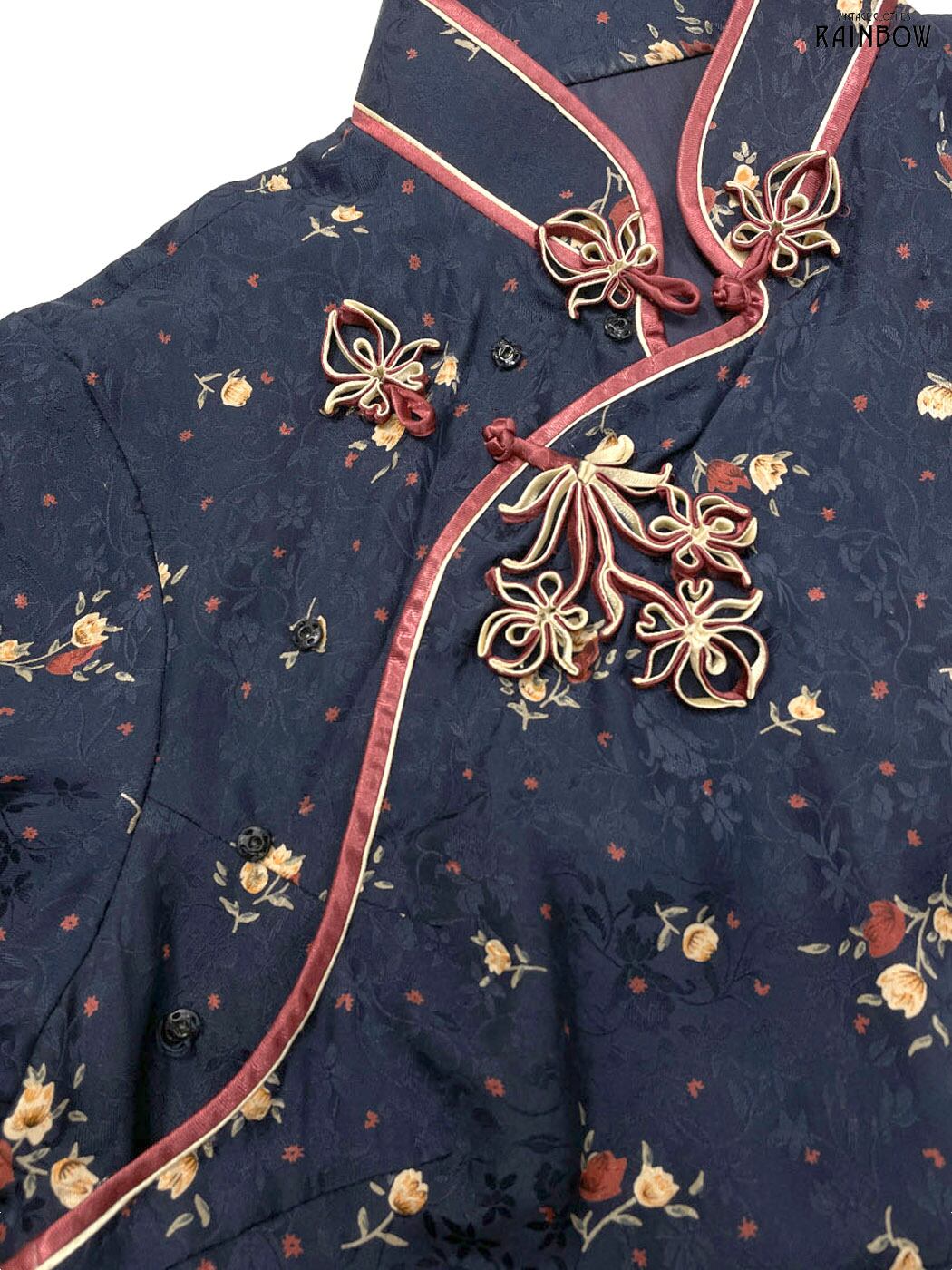 #ワンピース #ハーフスリーブ #膝丈 #ストレート #紺 #花柄 #ハイネック #チャイナドレス #クラシック #半袖花柄ワンピース