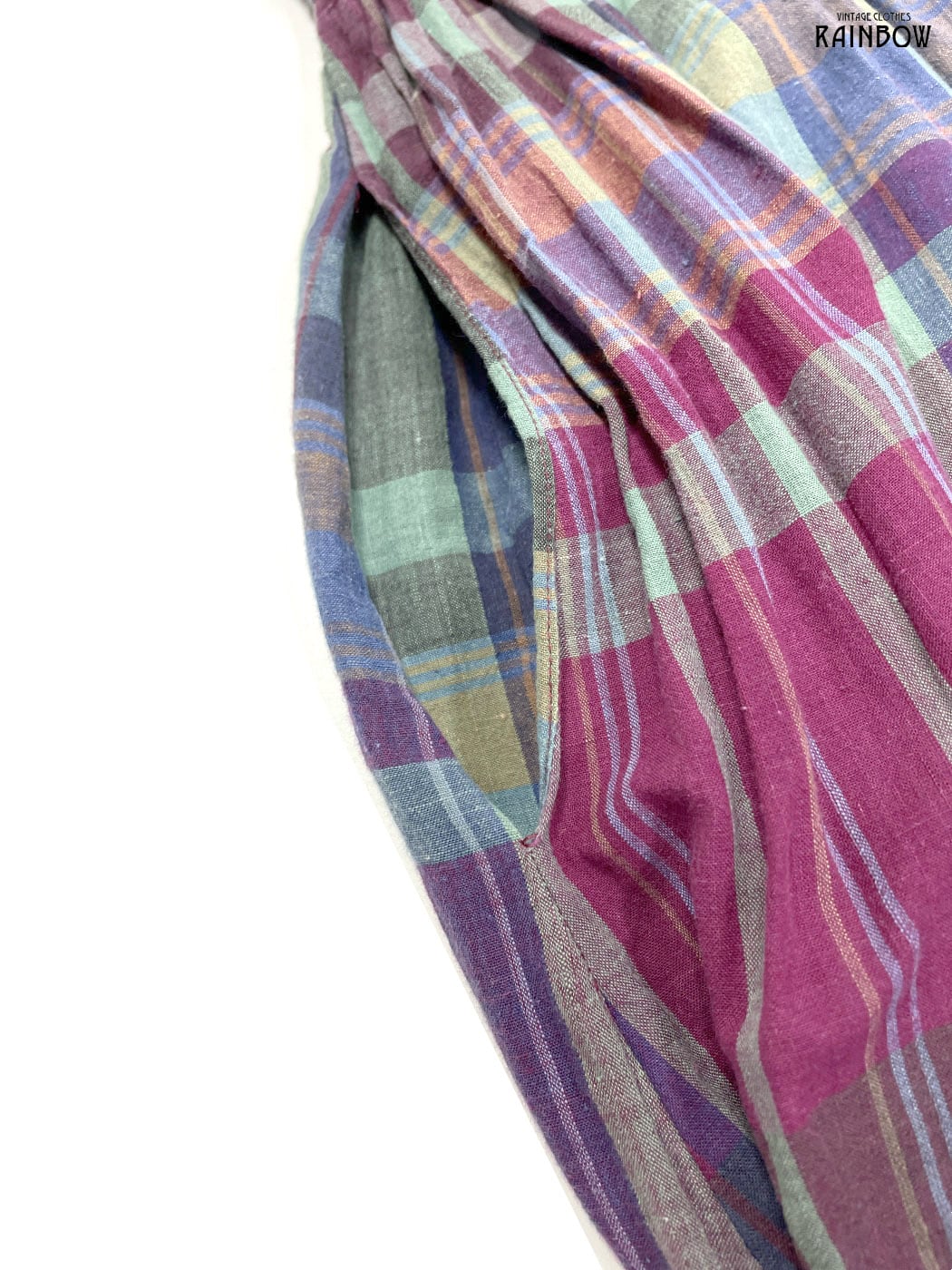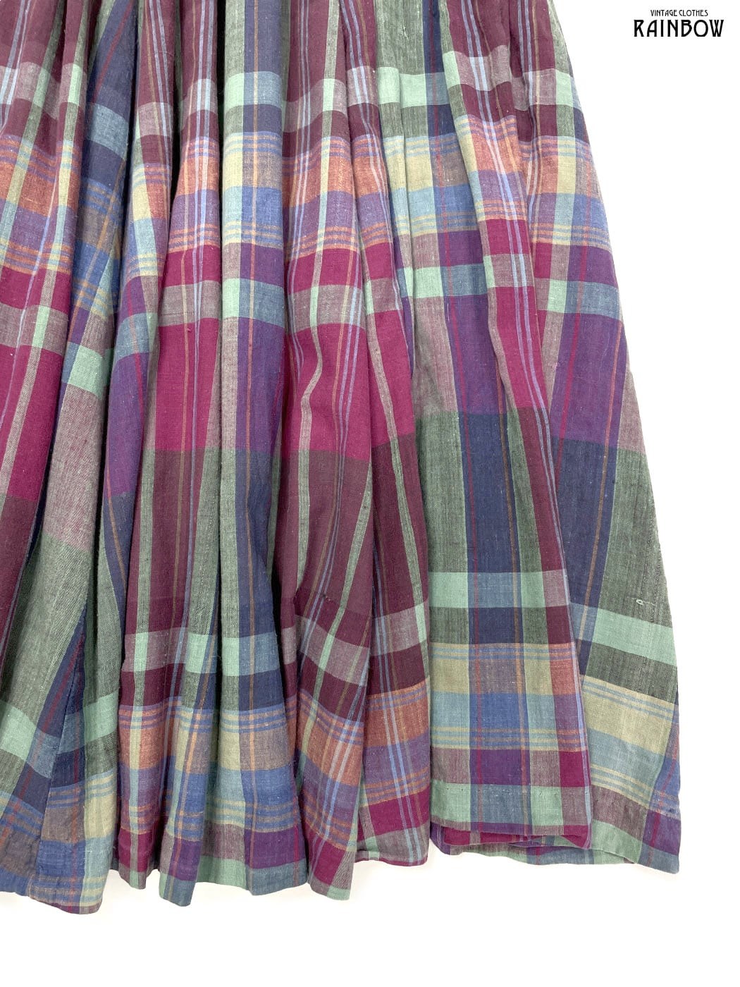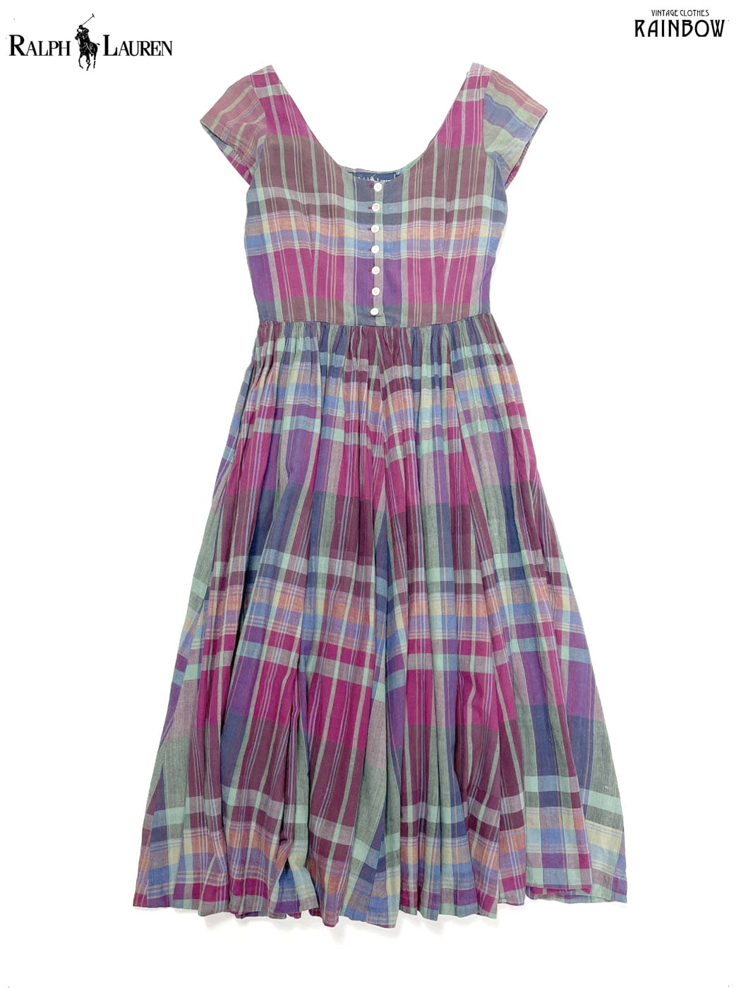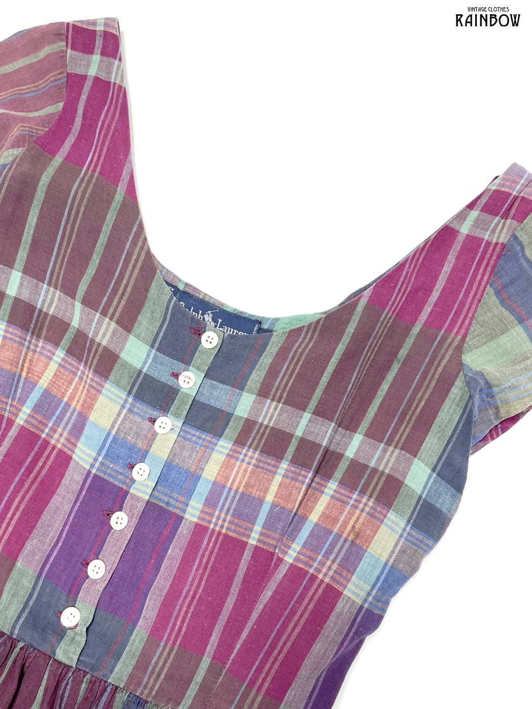 #ワンピース #ハーフスリーブ #ロング丈 #フレア #ウエスト切り替え #紫 #チェック柄 #ガーリー #コットン #半袖チェック柄ワンピース