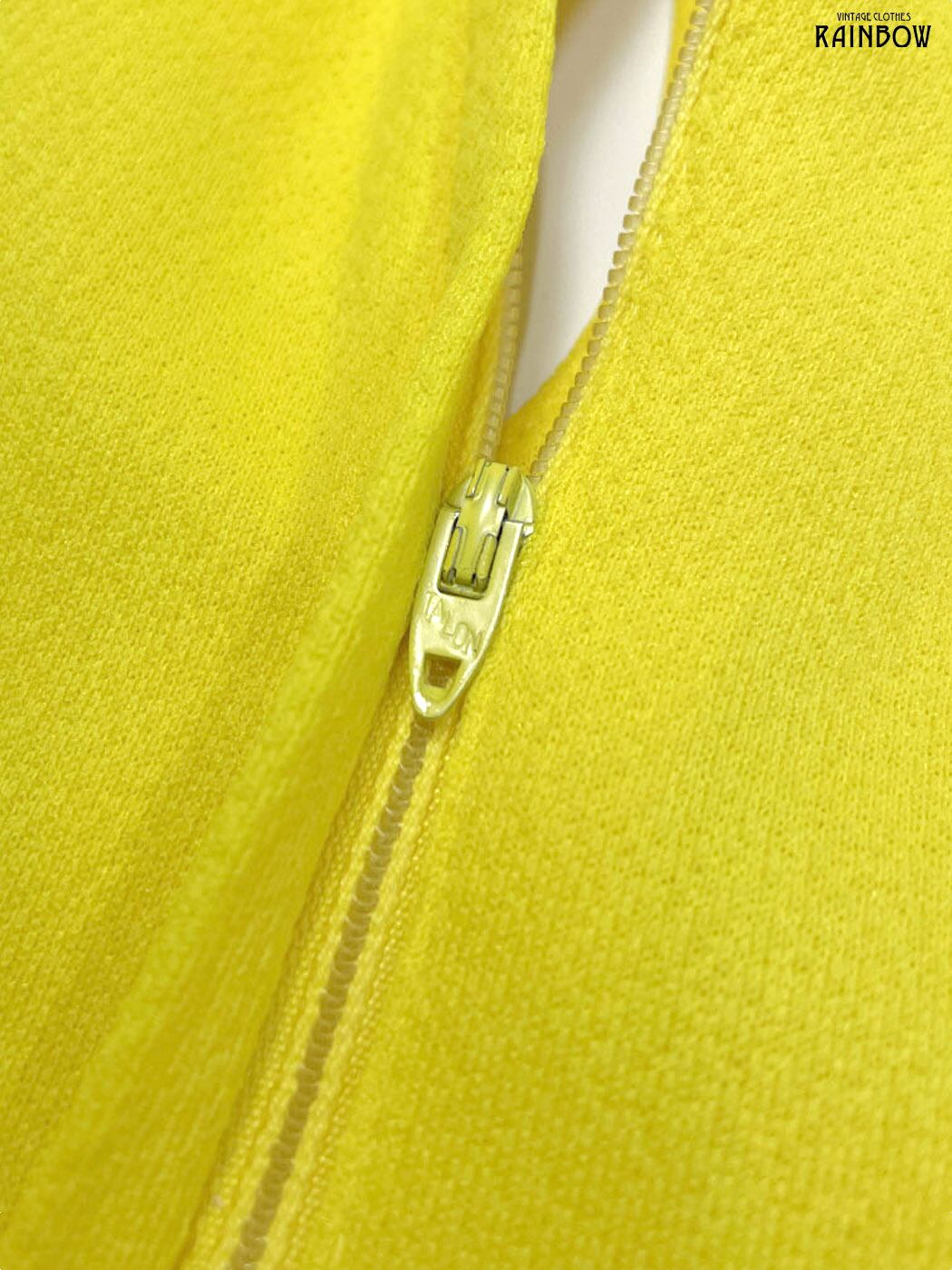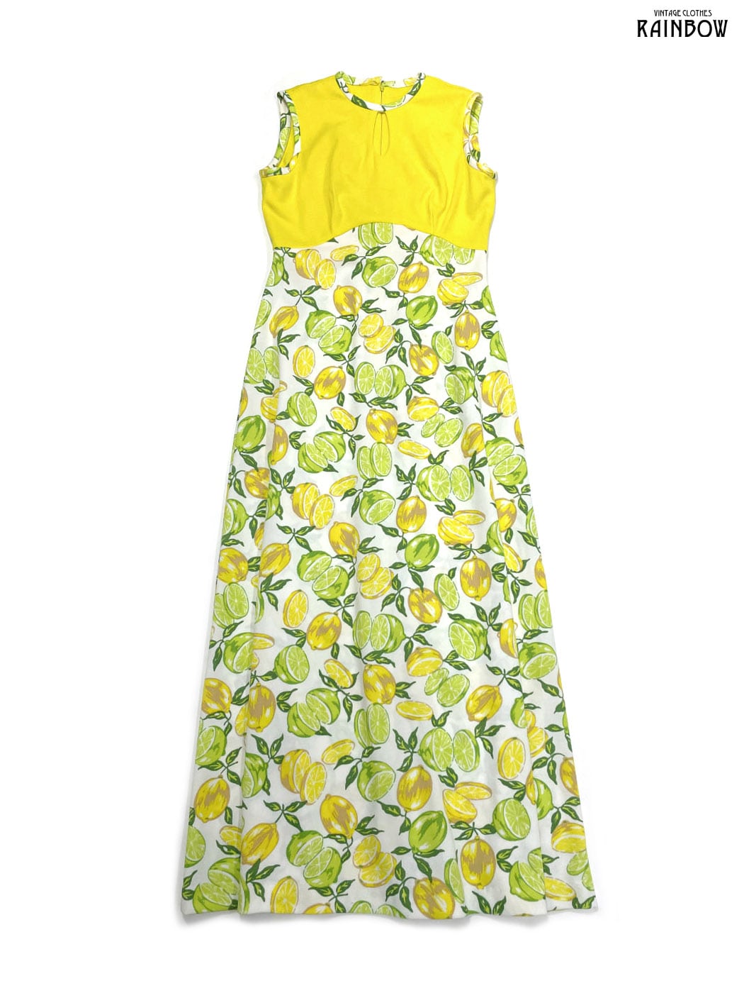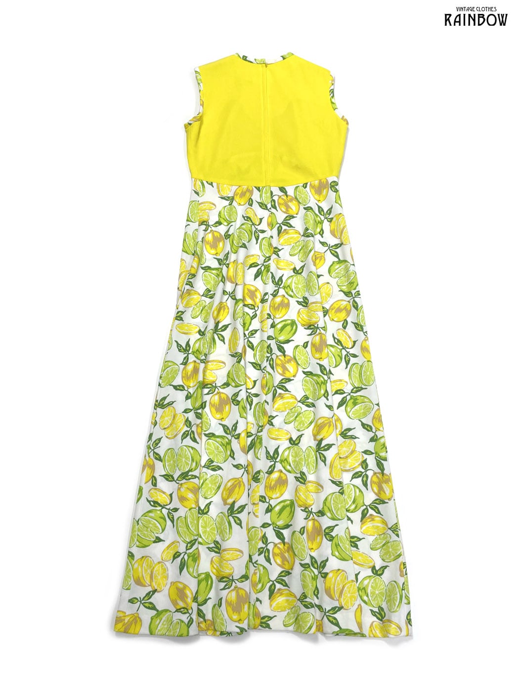 #ワンピース #ノースリーブ #ロング丈 #フレア #ウエスト切り替え #黄 #総柄 #レモン柄 #TALONジップ #切替 #ガーリー #ノースリーブレモン柄ワンピース