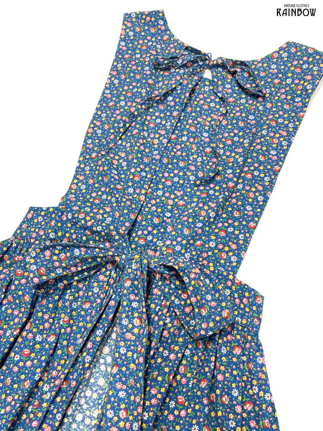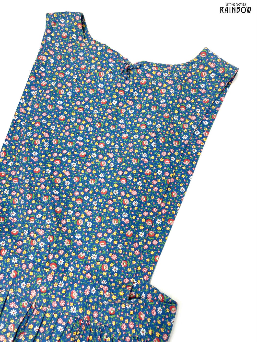 古着 バックオープン 後ろリボン 花柄 コットン ロング丈 ノースリーブ エプロン風 ワンピース 青 (otu2507009)