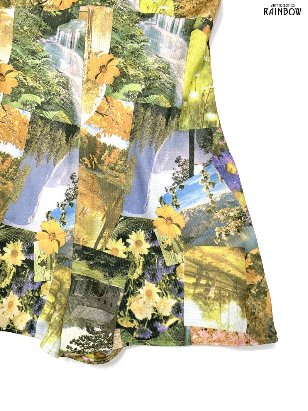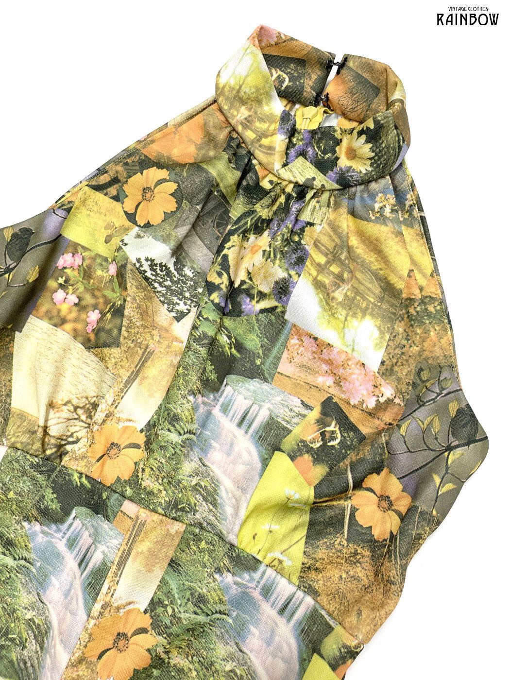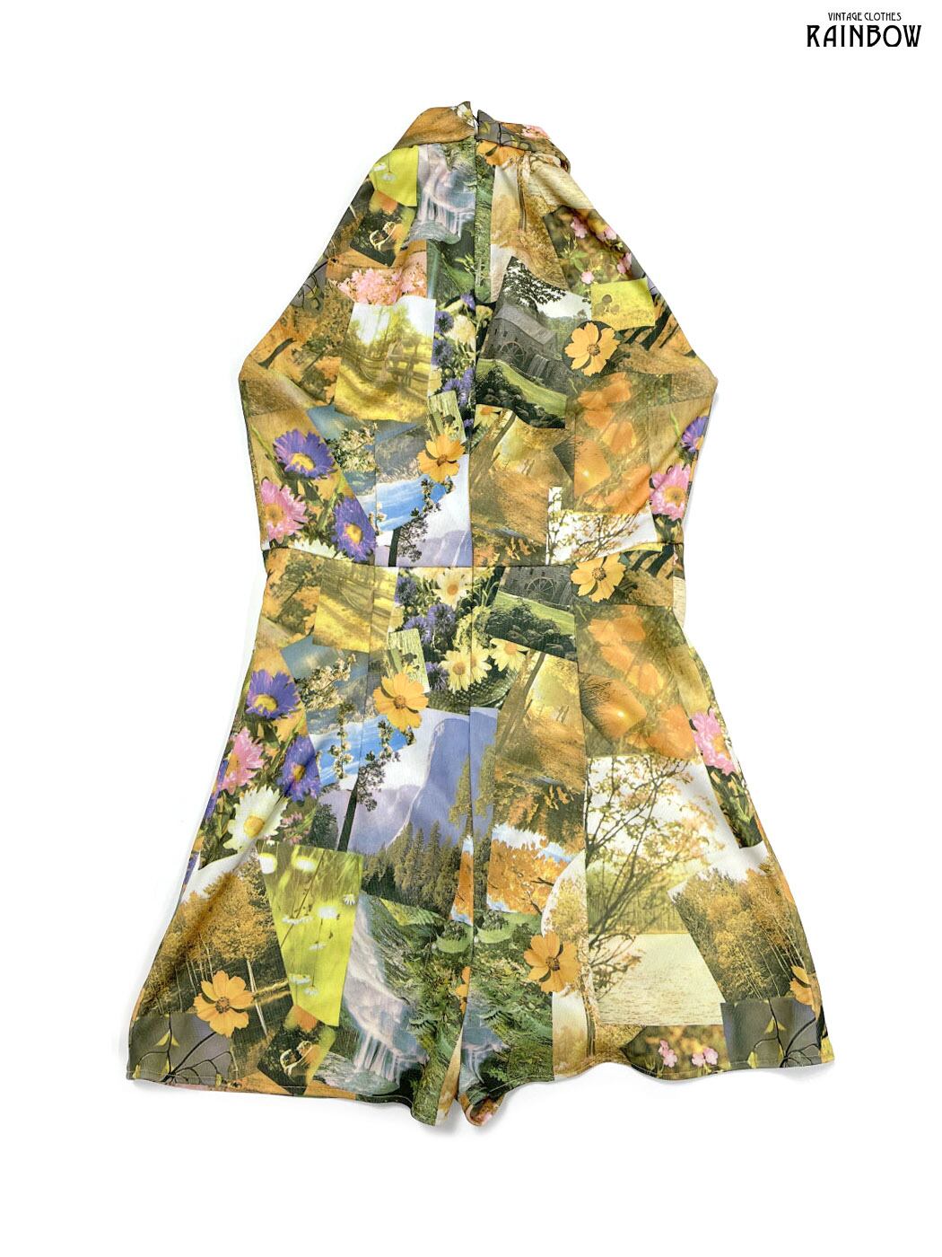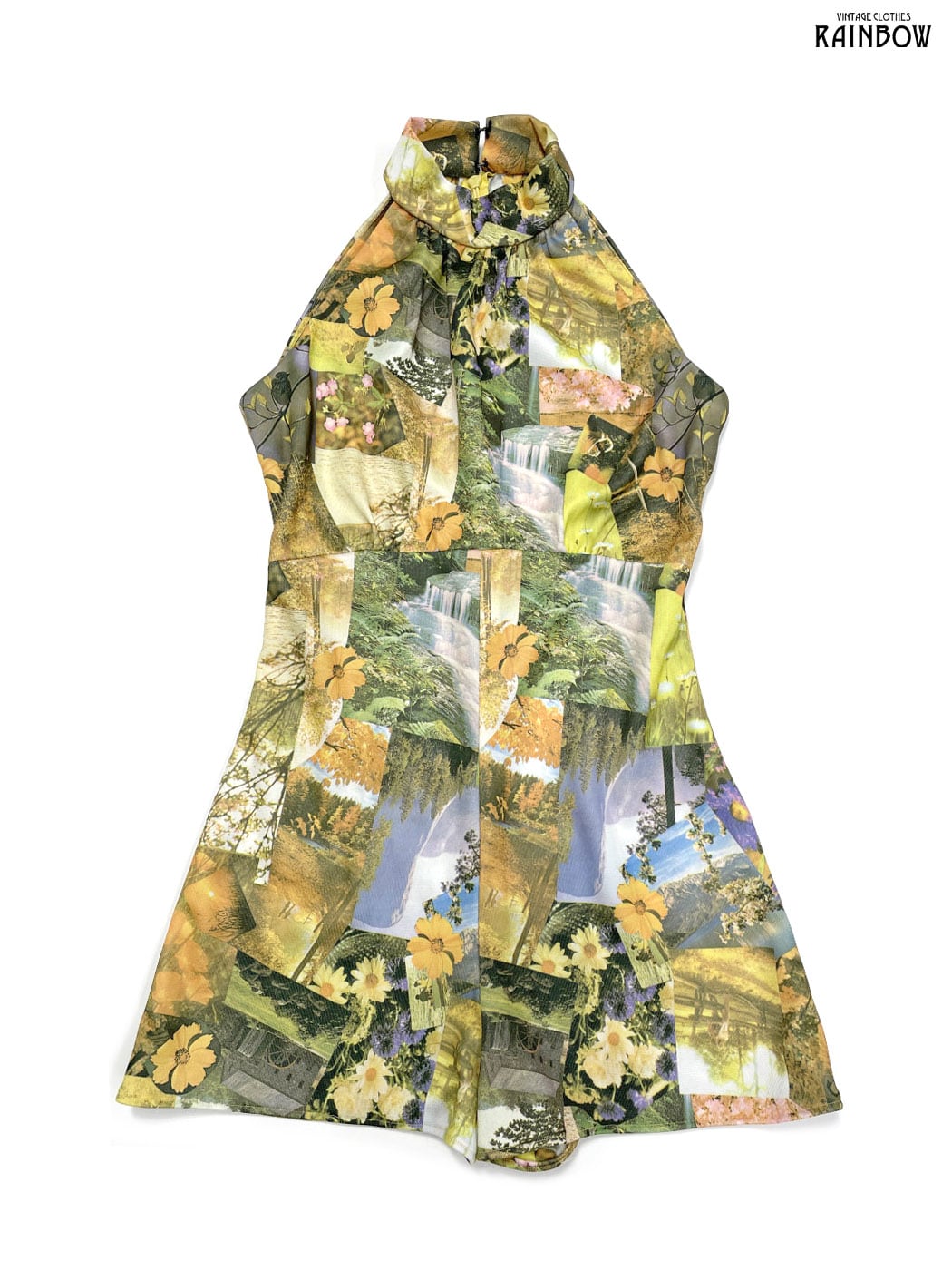 #ワンピース #オールインワン #ノースリーブ #ミニ丈 #黄 #花柄 #総柄 #ハイネック #ホルターネック #ガーリー #ノースリーブ花柄ワンピース