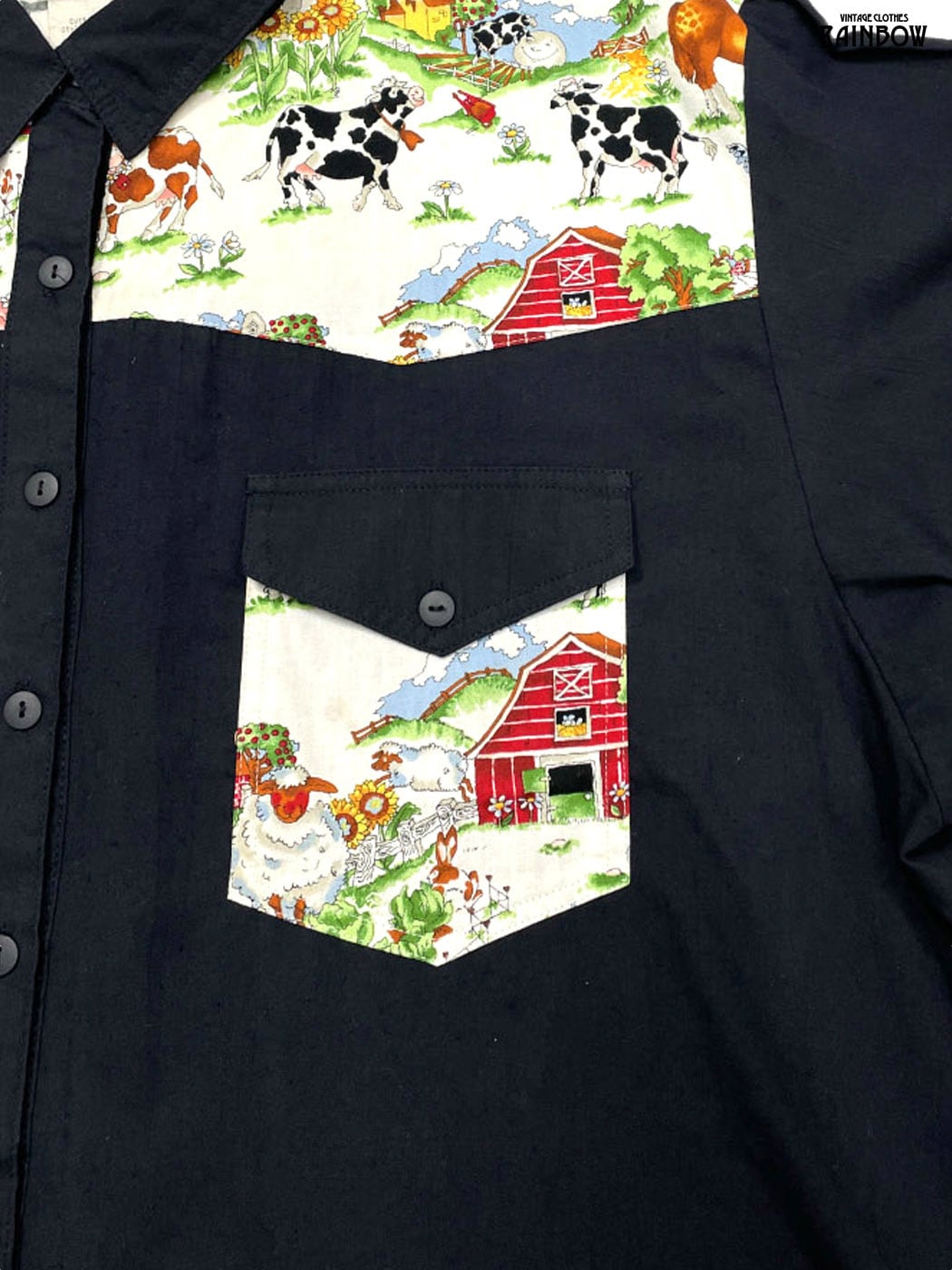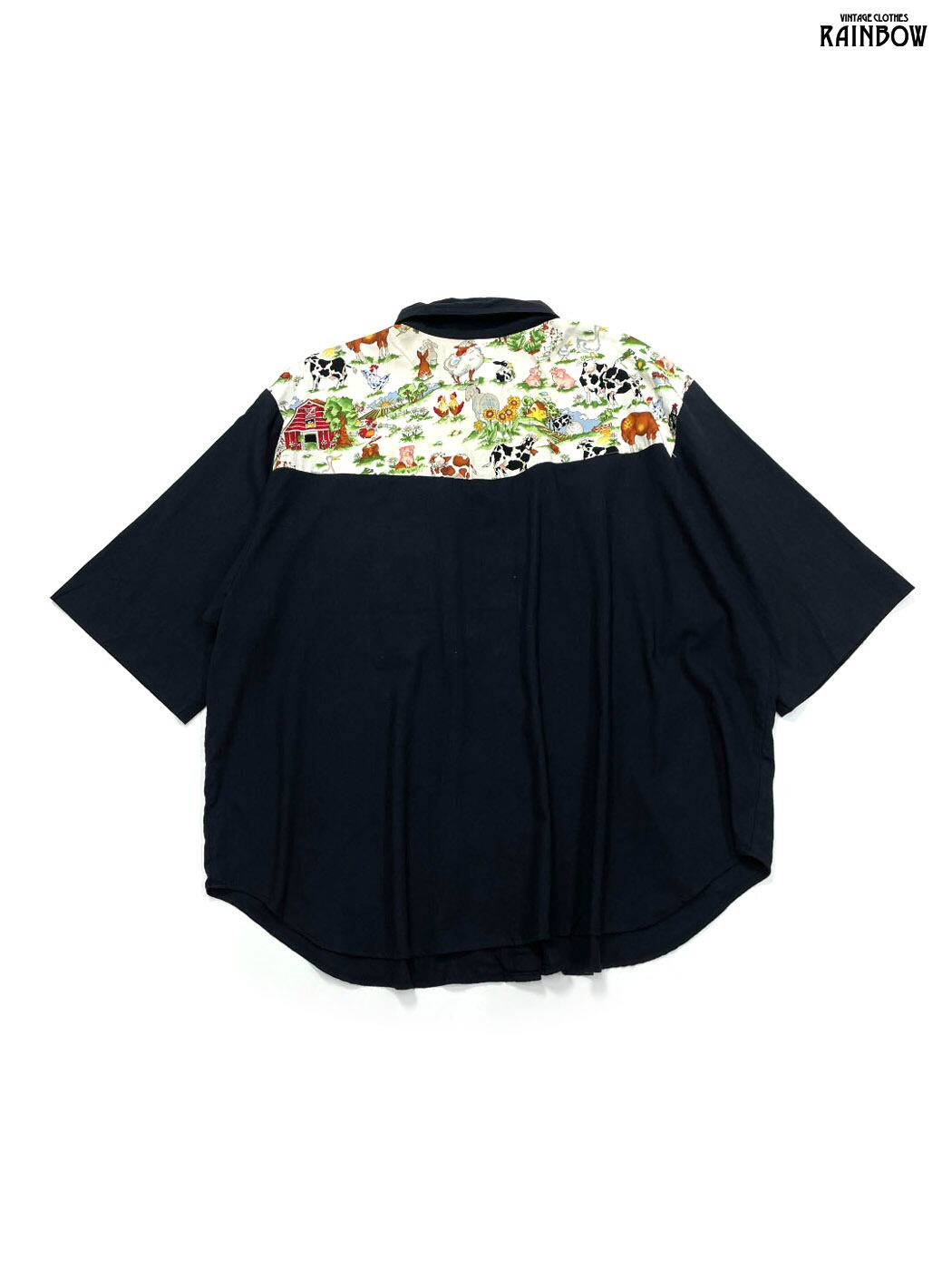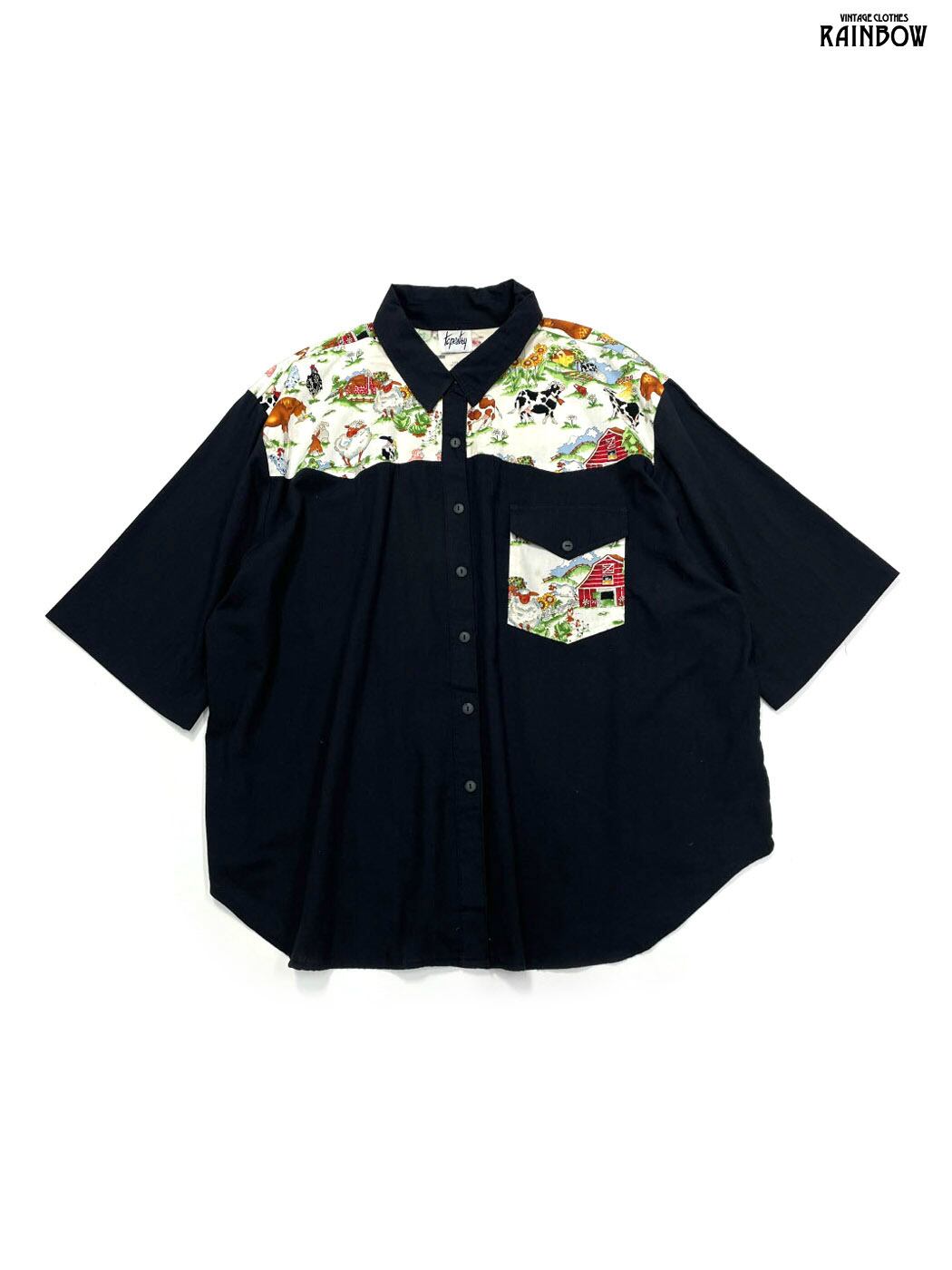 #ブラウス #シャツ #ハーフスリーブ #黒 #総柄 #牧場 #アメリカ製 #コットン #半袖柄シャツ