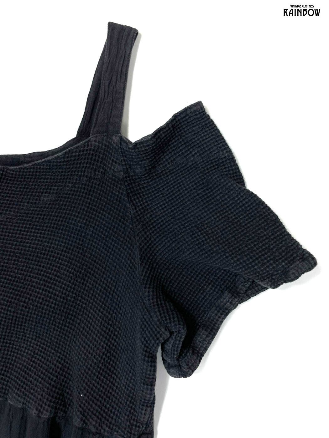 #ワンピース #ハーフスリーブ #ロング丈 #ティアード #ウエスト切り替え #黒 #無地 オープンショルダー #シック #コットン #ブラックワンピース