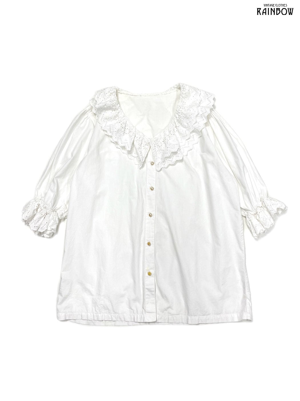 #ブラウス #bブラウス #ハーフスリーブ #白 #無地 #フリル #刺繍 #レース #前開き #パールボタン #ガーリー #コットン #レースシャツ