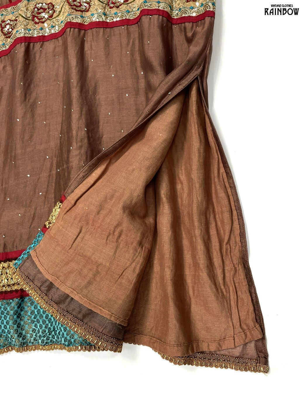 #ワンピース #ロングスリーブ #膝丈 #茶 #総柄 #刺繍 #スリット #スパンコール #ヴィンテージ #刺繍ワンピース