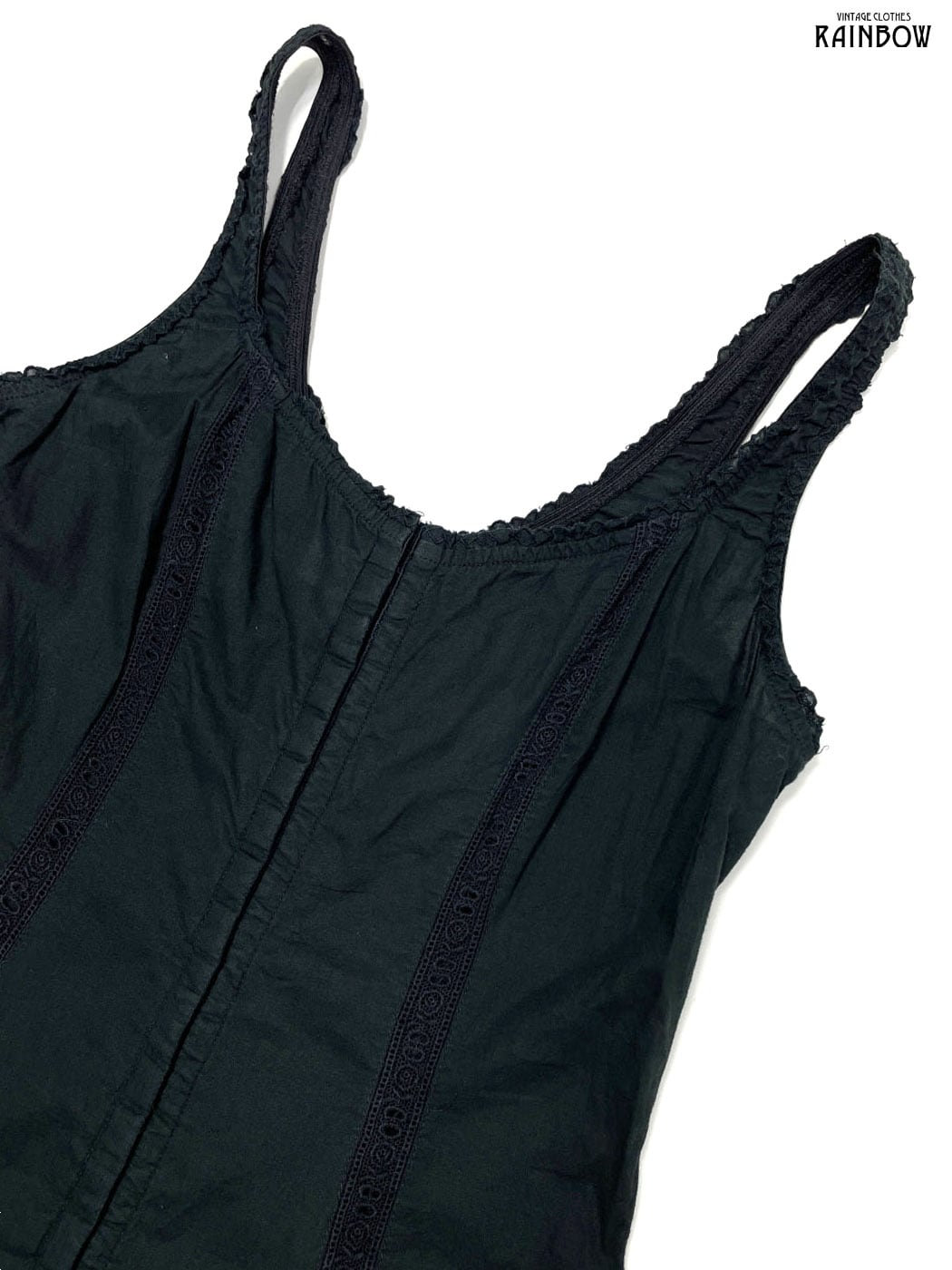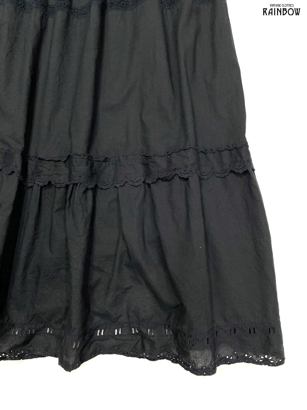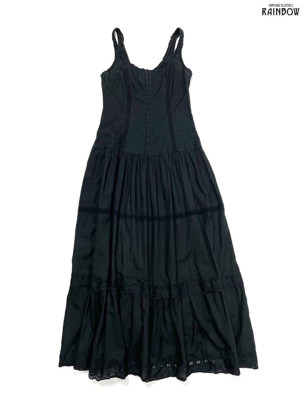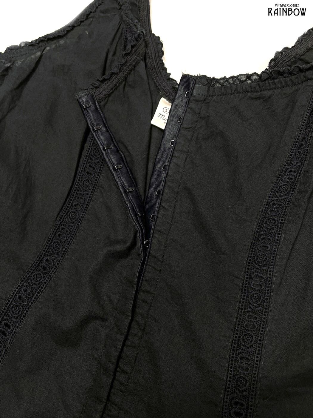 #ワンピース #ノースリーブ #ロング丈 #ティアード #ウエスト切り替え #黒 #無地 #イタリア製 #フリル #レース #シンプル #コットン #ブラックワンピース