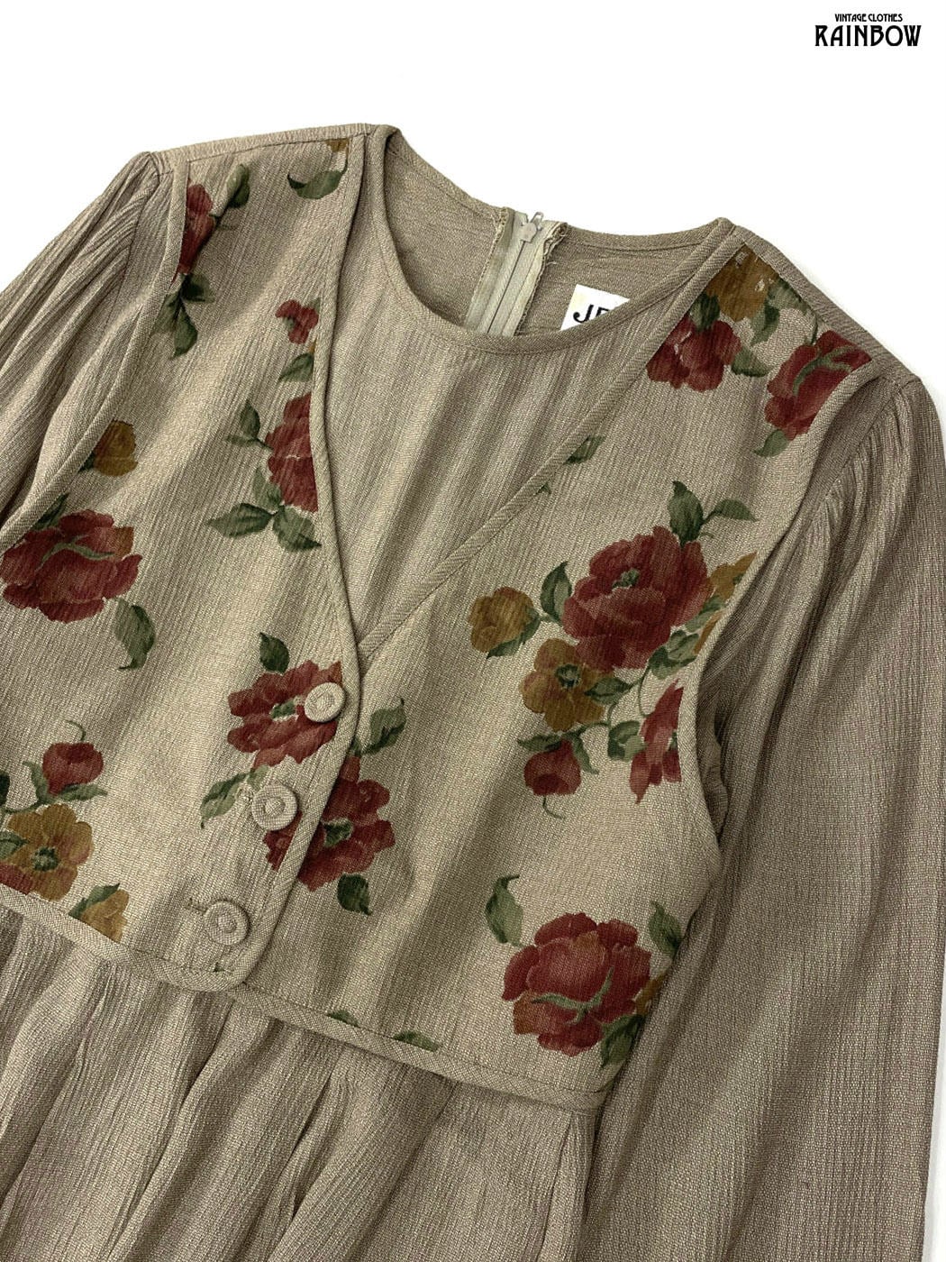#ワンピース #ロングスリーブ #ロング丈 #ウエスト切り替え #茶 #ベージュ #花柄 #無地 #レイヤード風 #クラシック #レーヨン #長袖花柄ワンピース