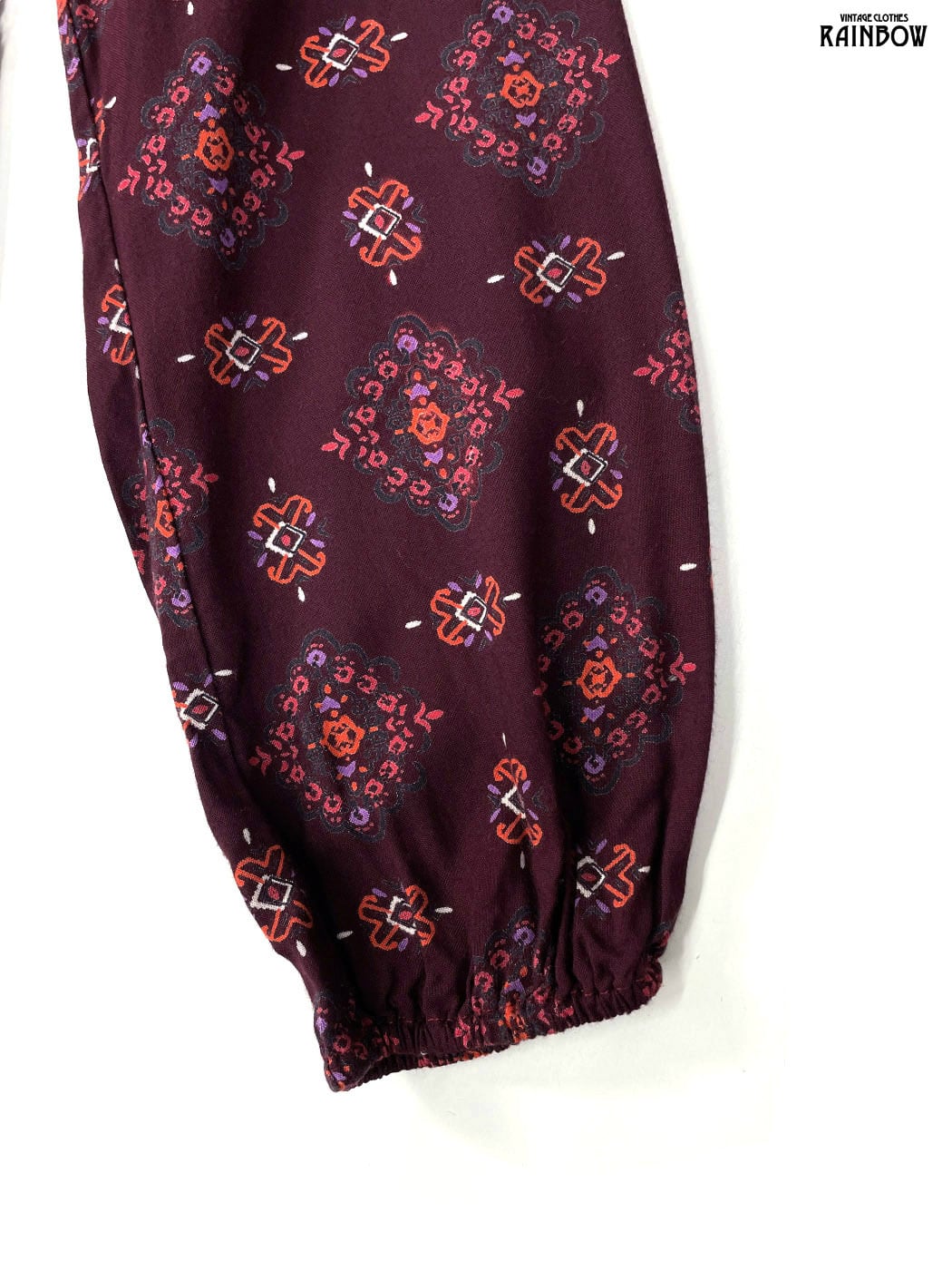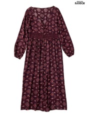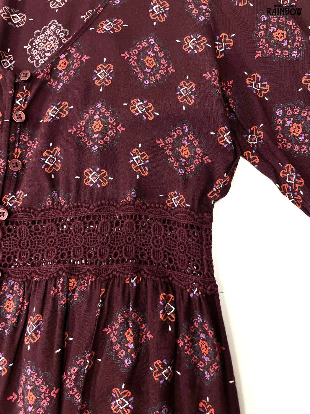 #ワンピース #ロングスリーブ #ロング丈 #ウエスト切り替え #赤 #ボルドー #総柄 #レース #前開き #クラシック #レーヨン #長袖総柄ワンピース
