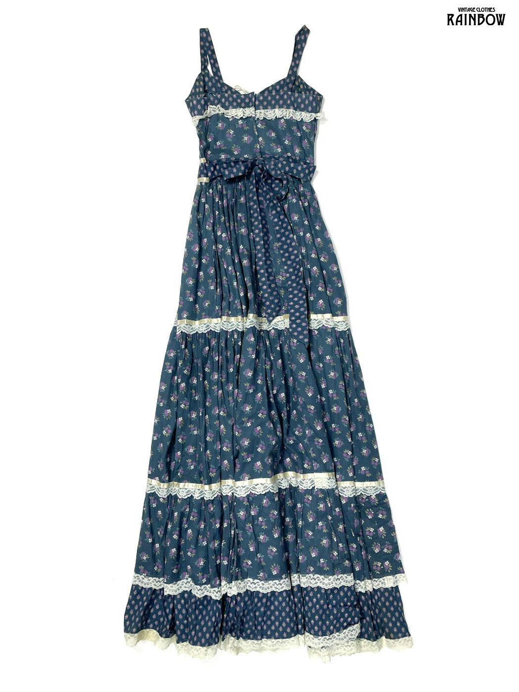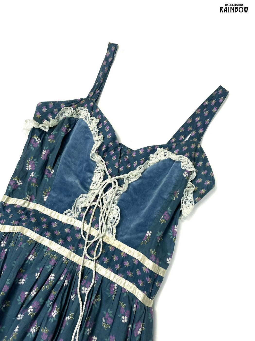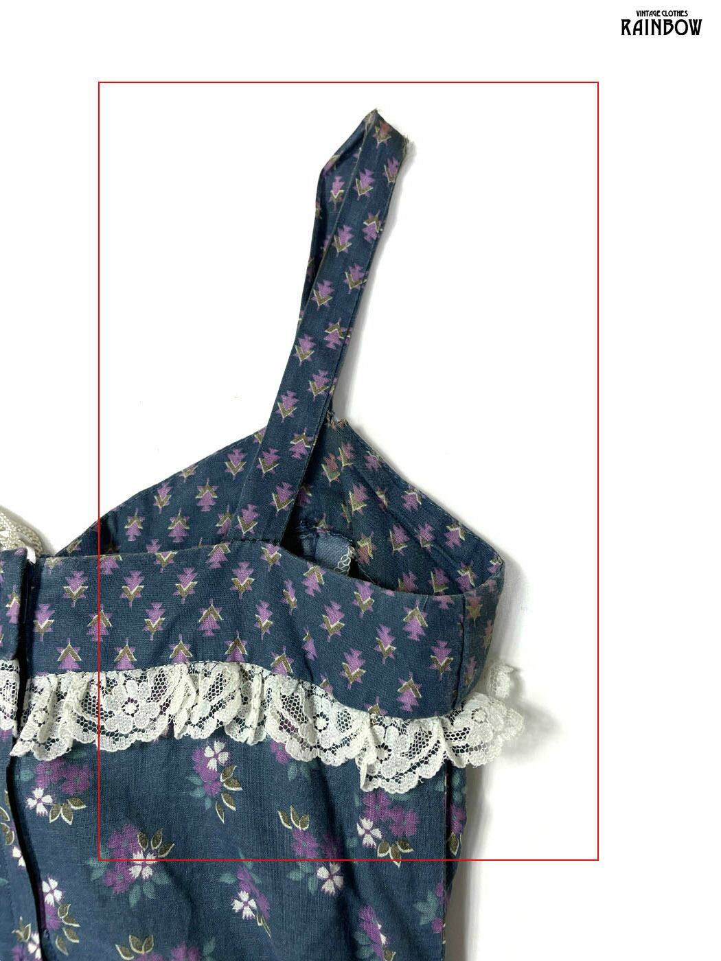 古着 レース 花柄 コットン100% ロング丈 キャミソール ティアード ワンピース 紺 (otu2508083)