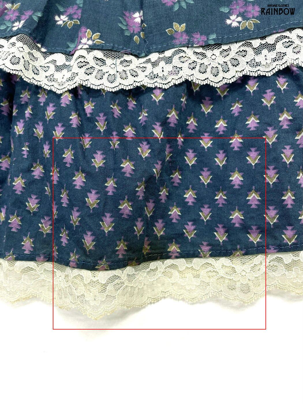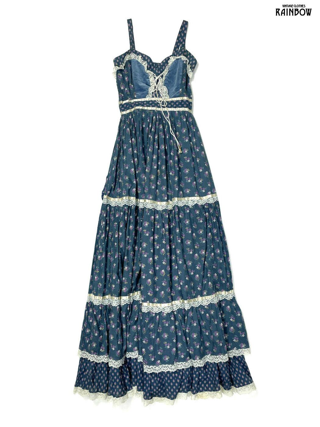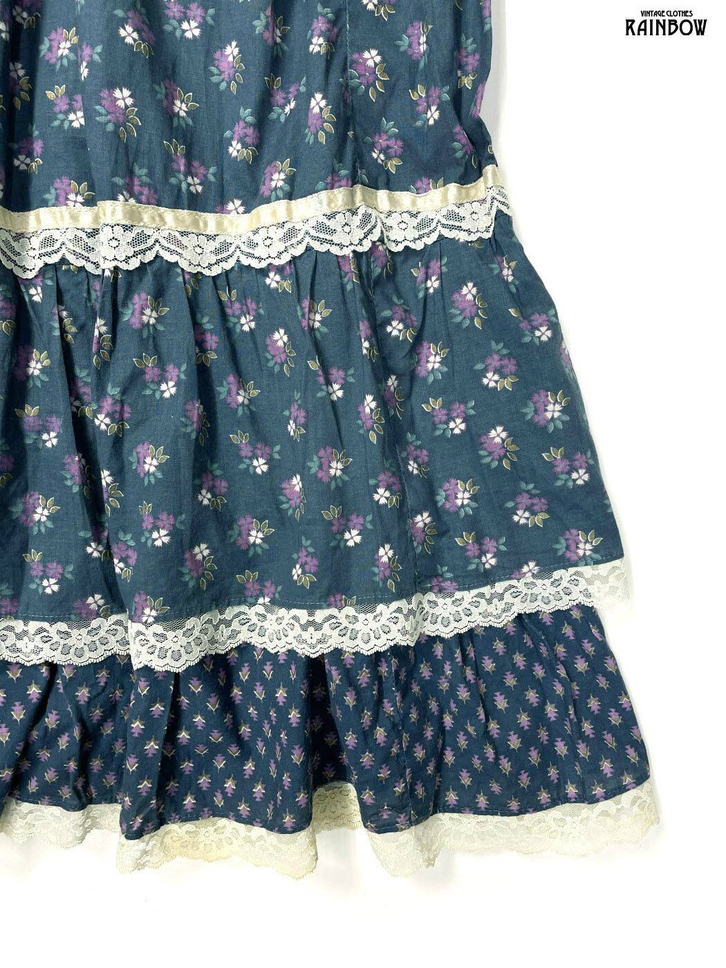 古着 レース 花柄 コットン100% ロング丈 キャミソール ティアード ワンピース 紺 (otu2508083)