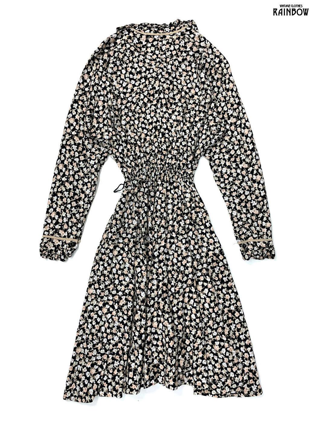 #ワンピース #ロングスリーブ #膝丈 #ゴムウエスト #黒 #花柄 #クラシック #レーヨン #長袖花柄ワンピース