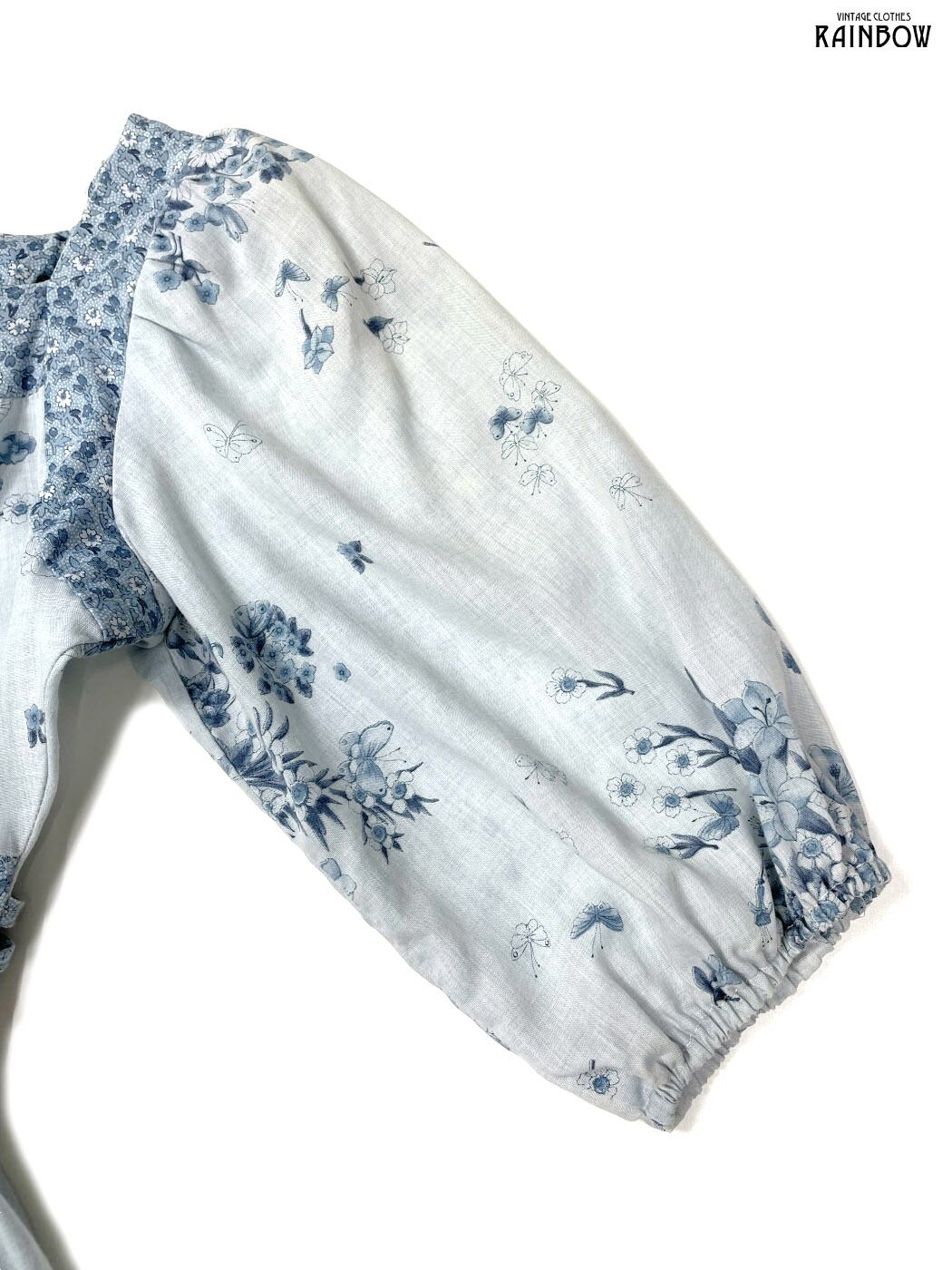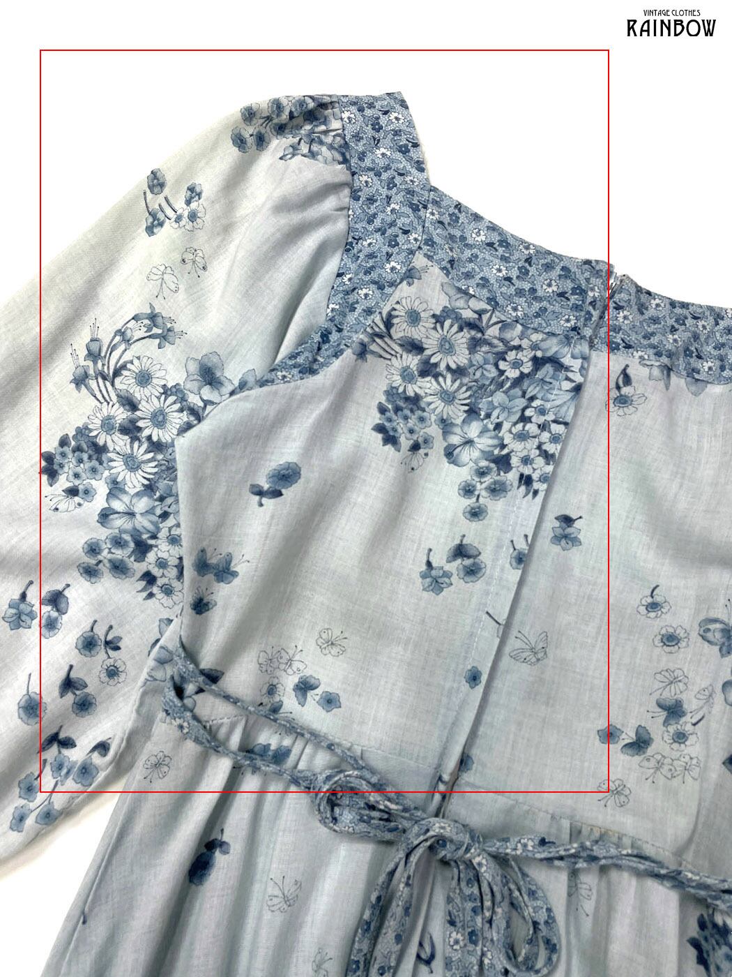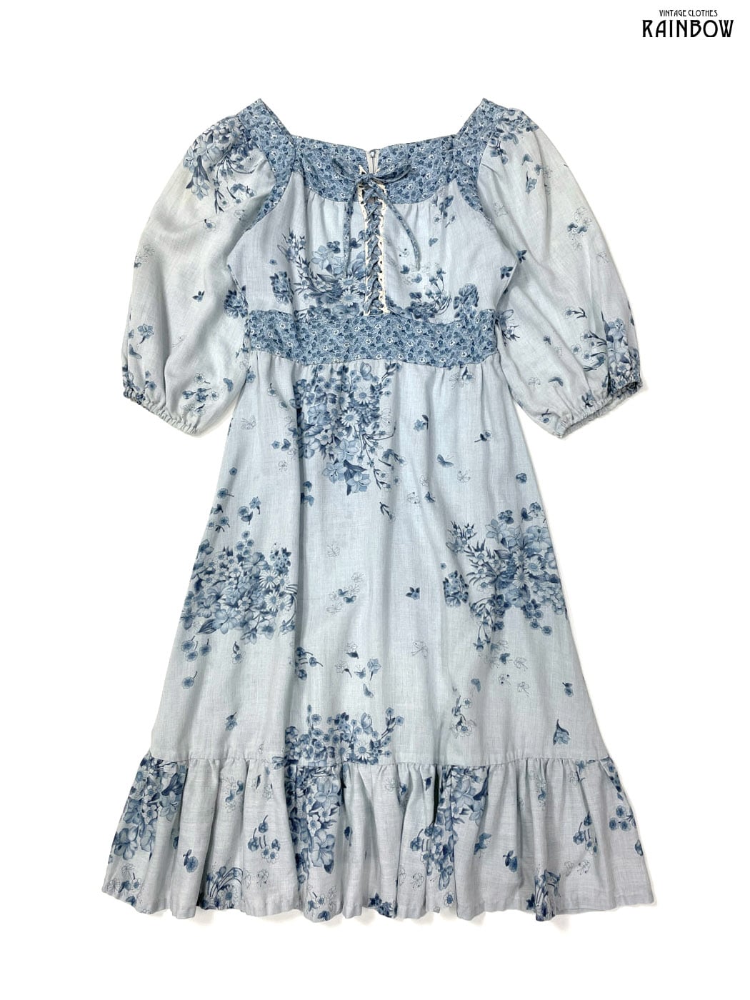 #ワンピース #ハーフスリーブ #ロング丈 #ウエスト切り替え #青 #水色 #花柄 #リボン #ガーリー #コットン #半袖花柄ワンピース