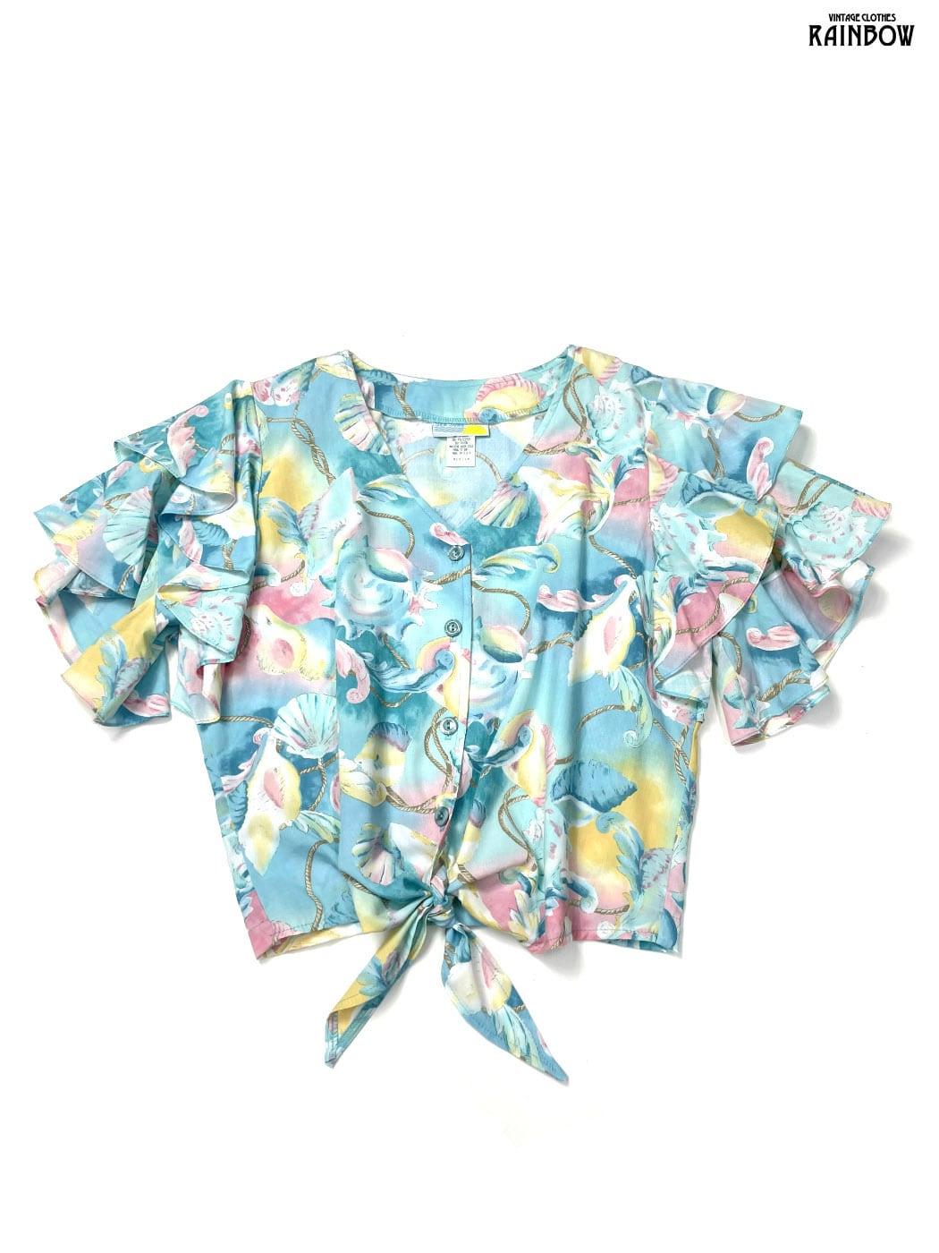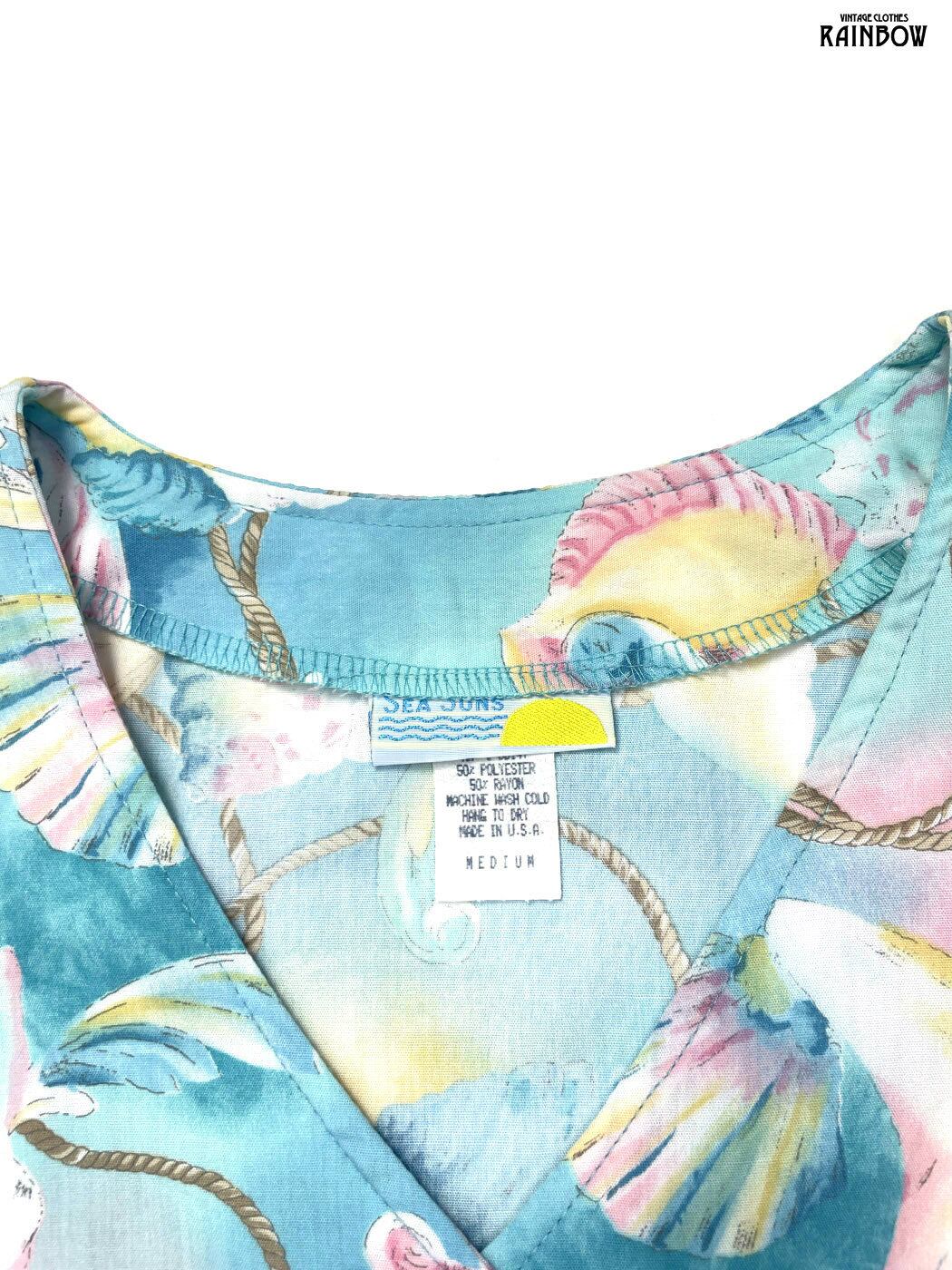 #ブラウス #bブラウス #ハーフスリーブ #青 #水色 #総柄 貝殻 #アメリカ製 #ガーリー #レーヨン #半袖柄ブラウス