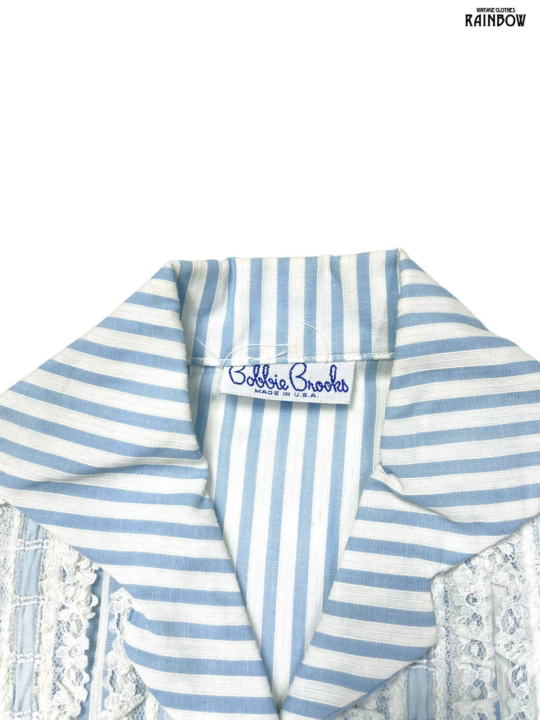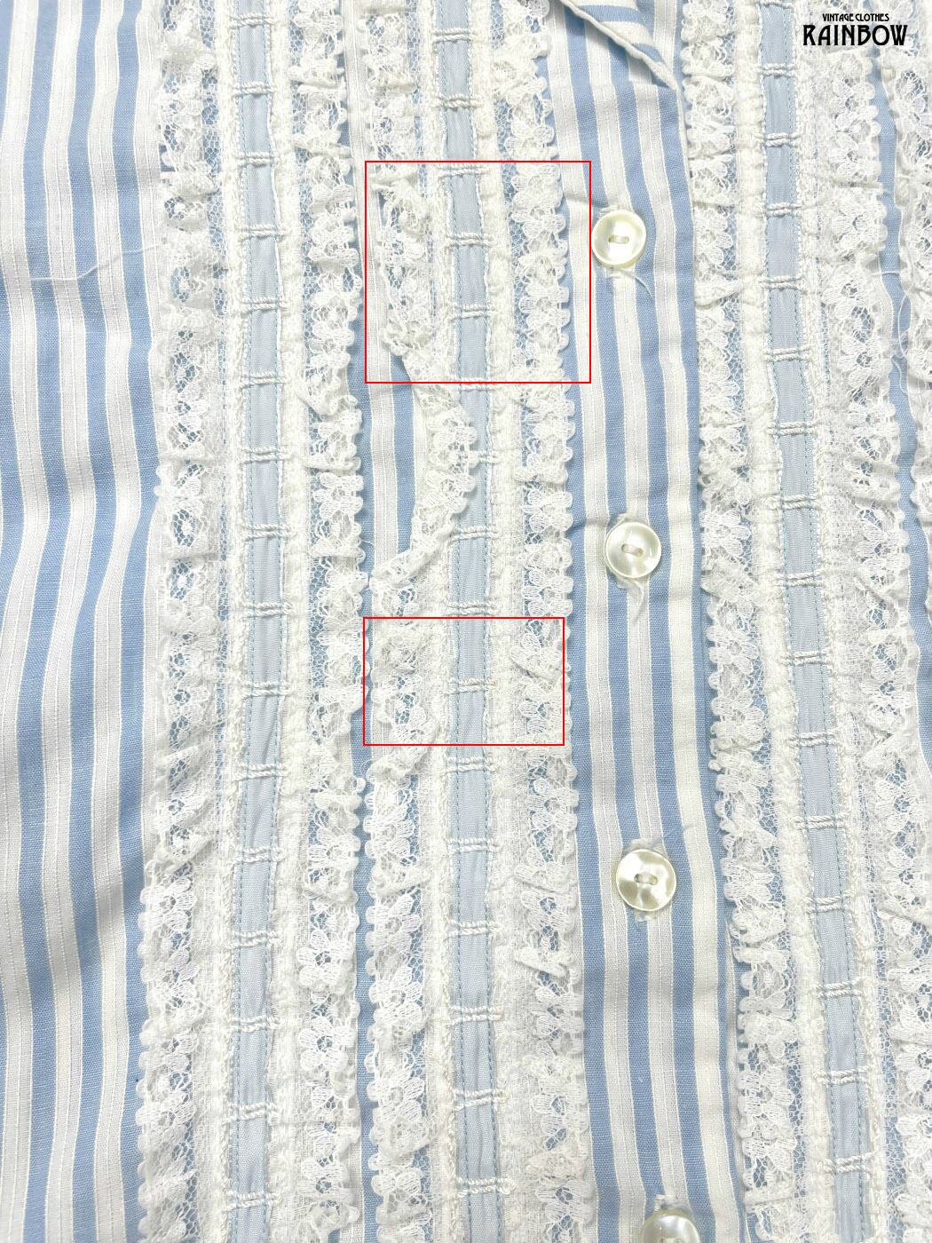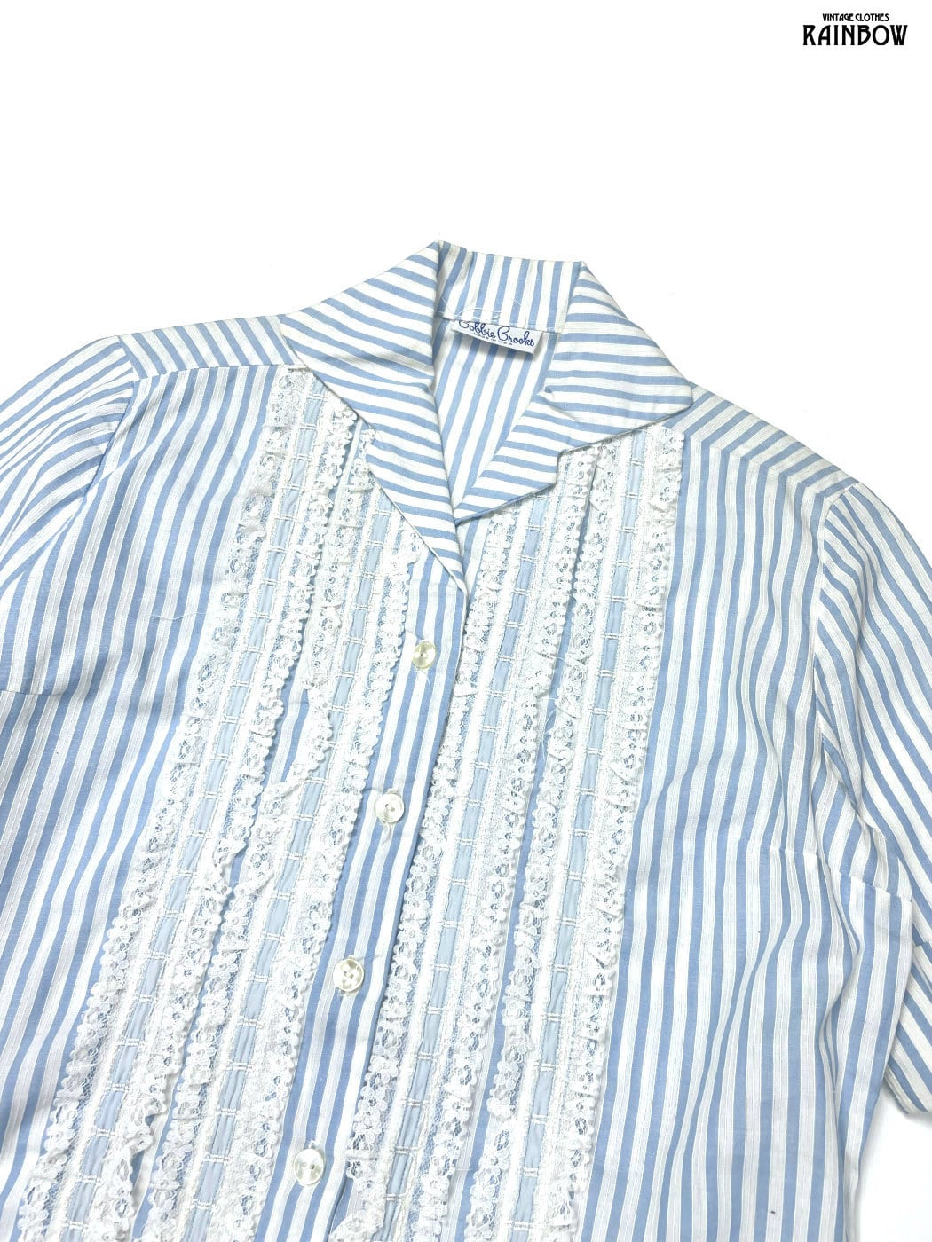 #ブラウス #bブラウス #ハーフスリーブ #青 #水色 #ストライプ柄 #アメリカ製 #レース #ガーリー #コットン #半袖レースシャツ