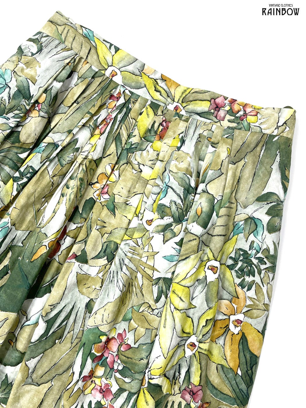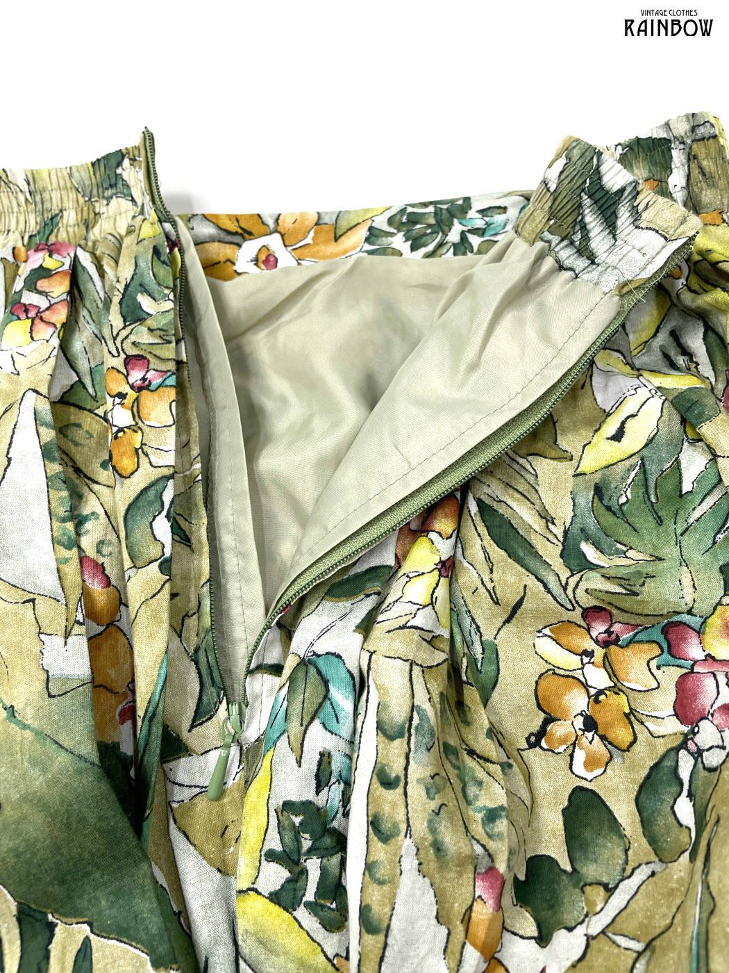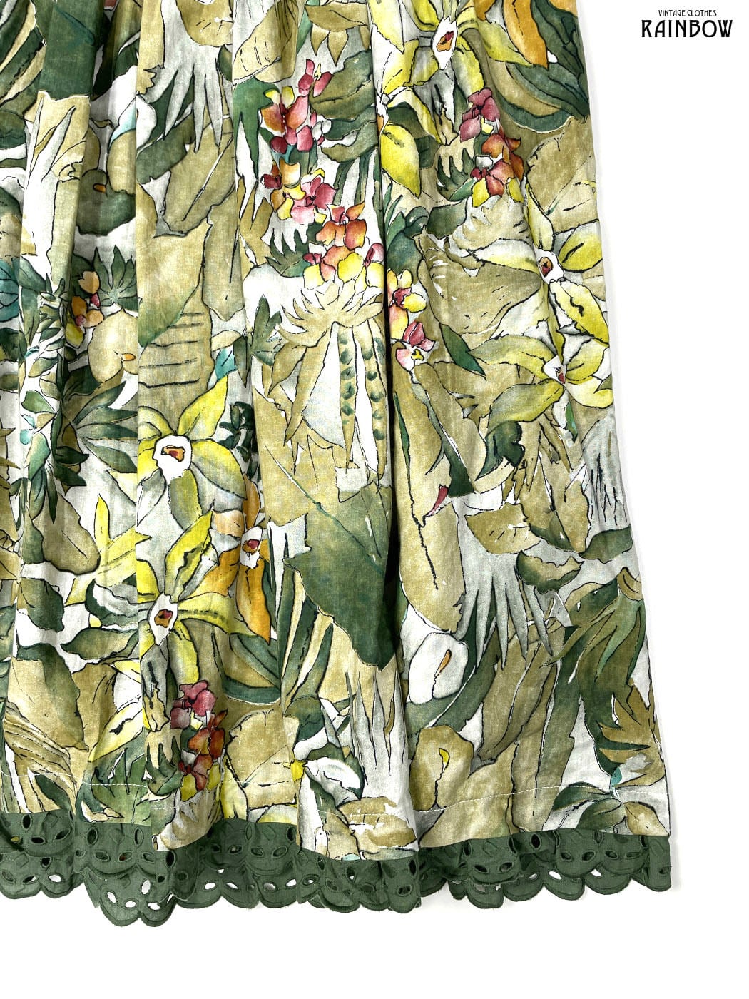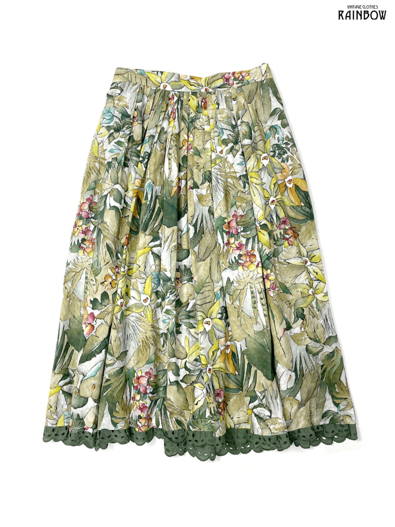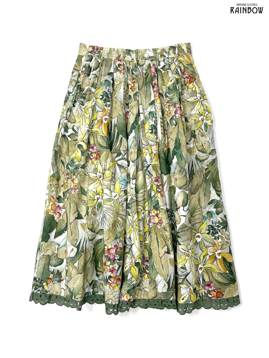 #スカート #膝丈 #フレア #ゴムウエスト #緑 #カーキ #花柄 #フリル #レース #クラシック #コットン #花柄スカート
