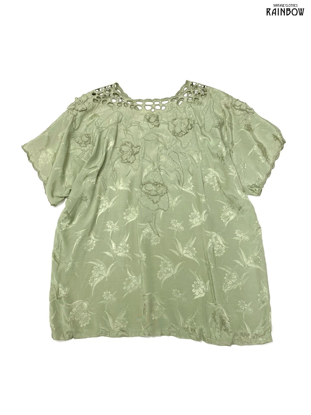 #ブラウス #bブラウス #ハーフスリーブ #緑 #カーキ #花柄 #刺繍 #クラシック #レーヨン #刺繍シャツ
