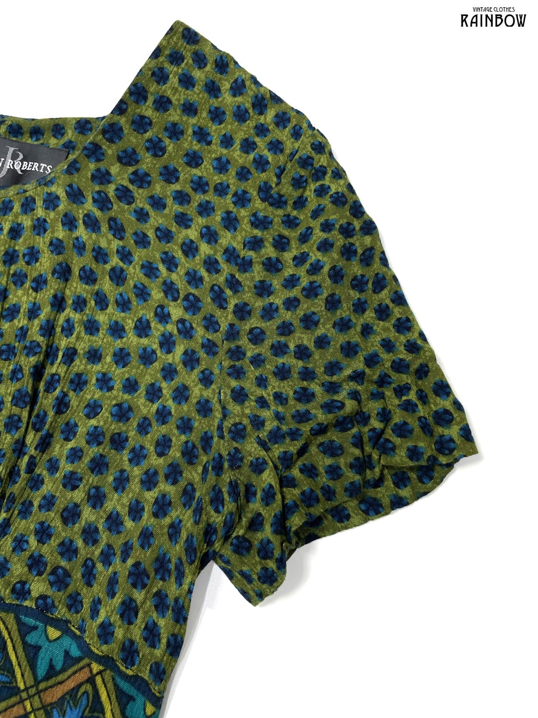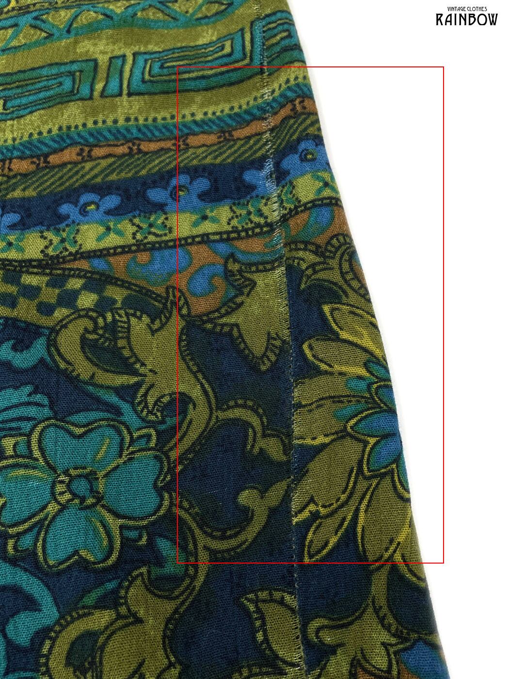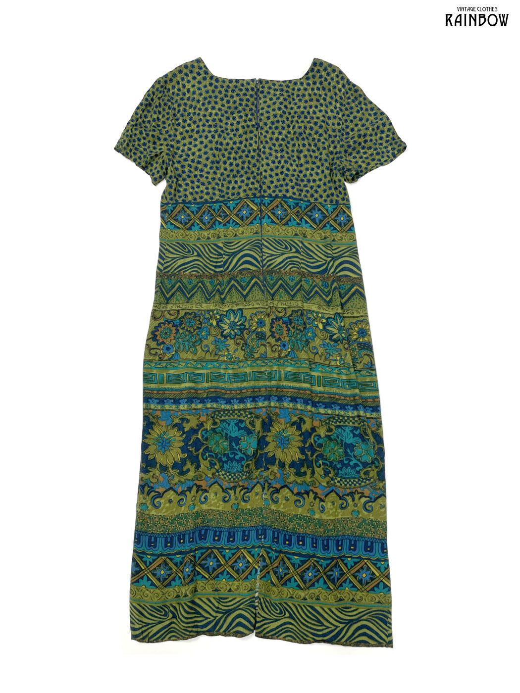 #ワンピース #ハーフスリーブ #ロング丈 #フレア #ストレート #バスト切り替え #緑 #カーキ #花柄 #エスニック柄 #エスニック #エスニックワンピース