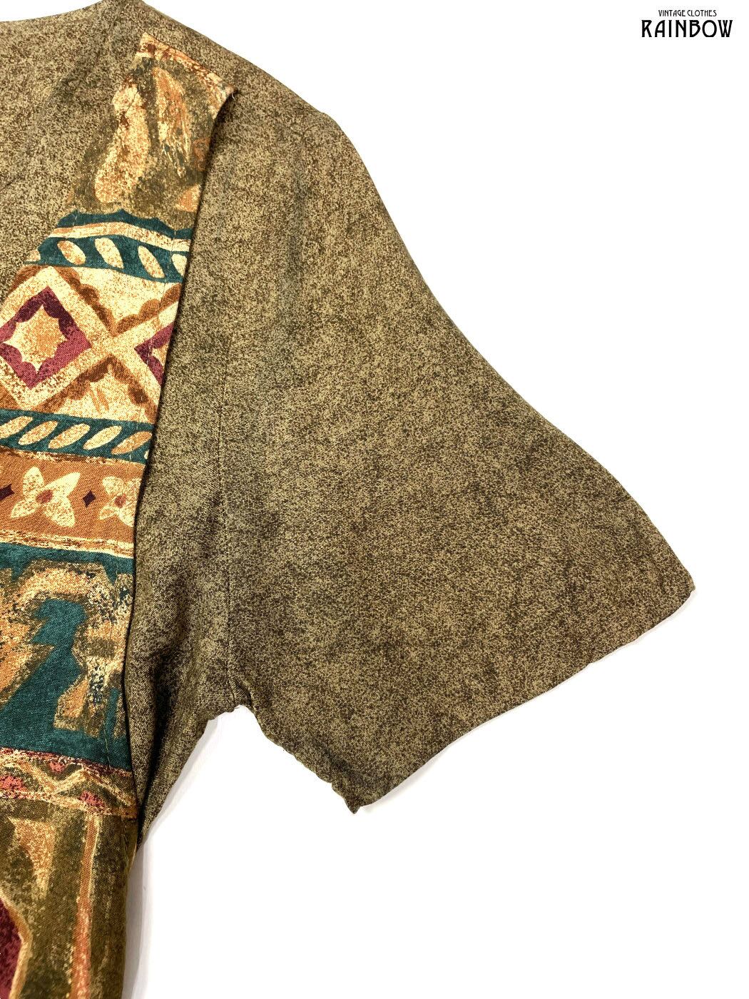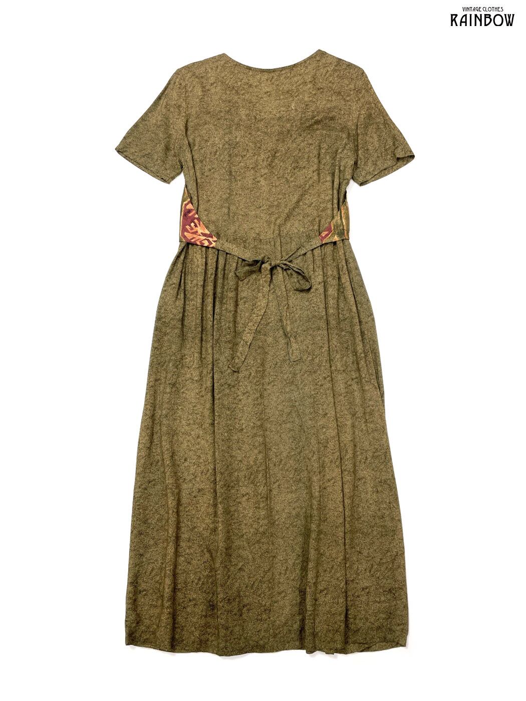 #ワンピース #ハーフスリーブ #ロング丈 #フレア #ウエスト切り替え #茶 #総柄 #エスニック柄 #アメリカ製 #リボン #レイヤード風 #ベスト風 #エスニック #レーヨン #エスニックワンピース