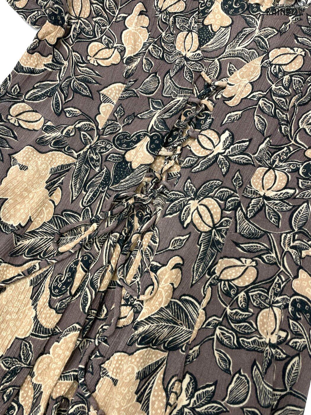 #ワンピース #ハーフスリーブ #ロング丈 #フレア #茶 #ベージュ #花柄 #リボン #編み上げリボン #エスニック #レーヨン #エスニックワンピース