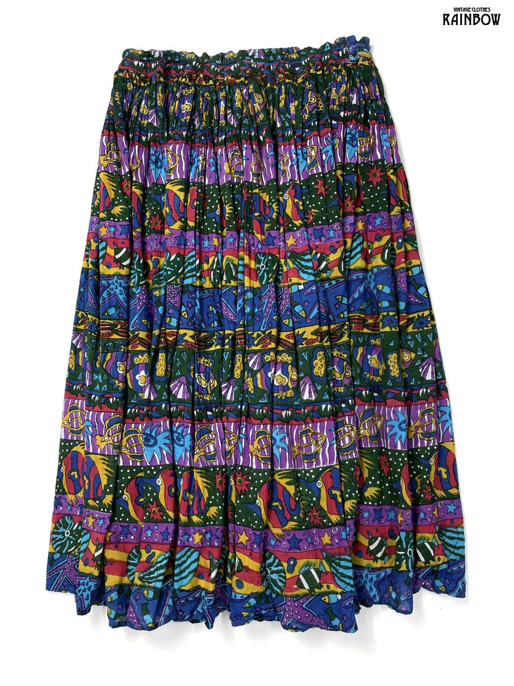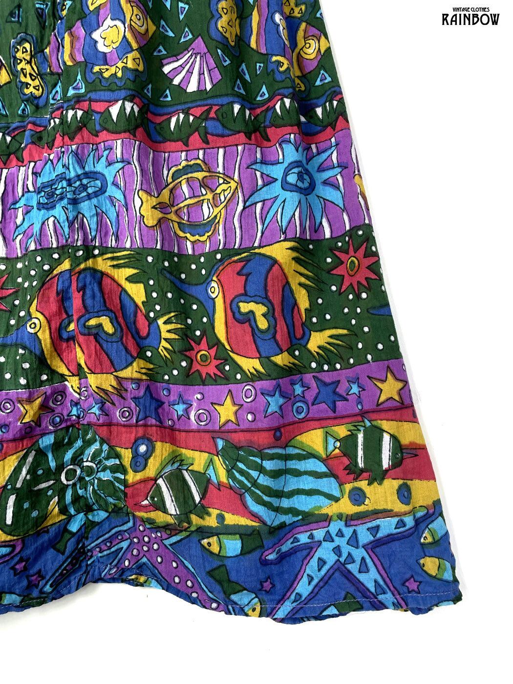 #スカート #ロング丈 #緑 #総柄 #魚 #シワ加工 #クラシック #コットン #柄スカート