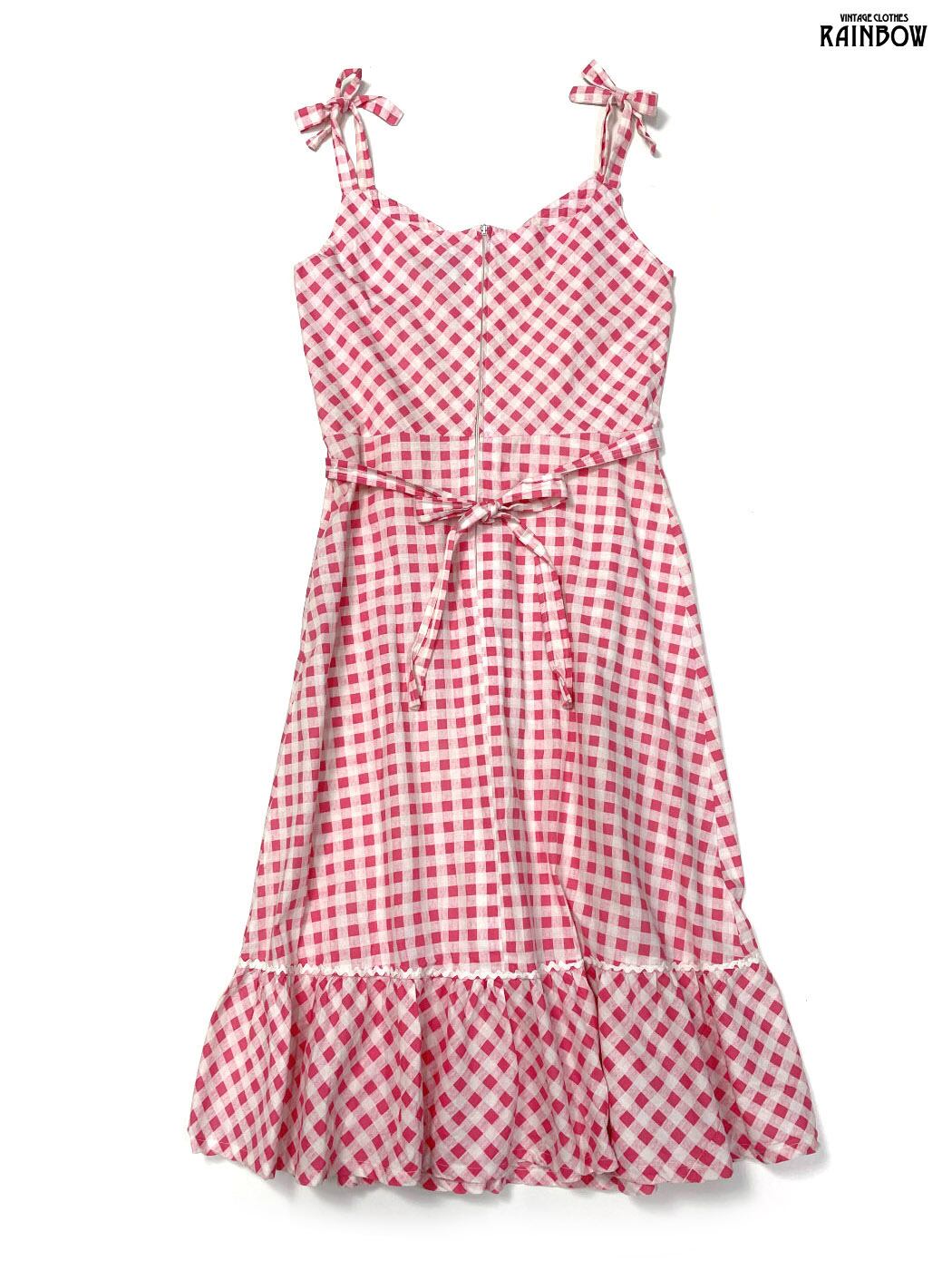 #ワンピース #キャミソール #ロング丈 #フレア #ウエスト切り替え #白 #ピンク #チェック柄 #リボン #レース #ガーリー #コットン #キャミソールチェック柄ワンピース
