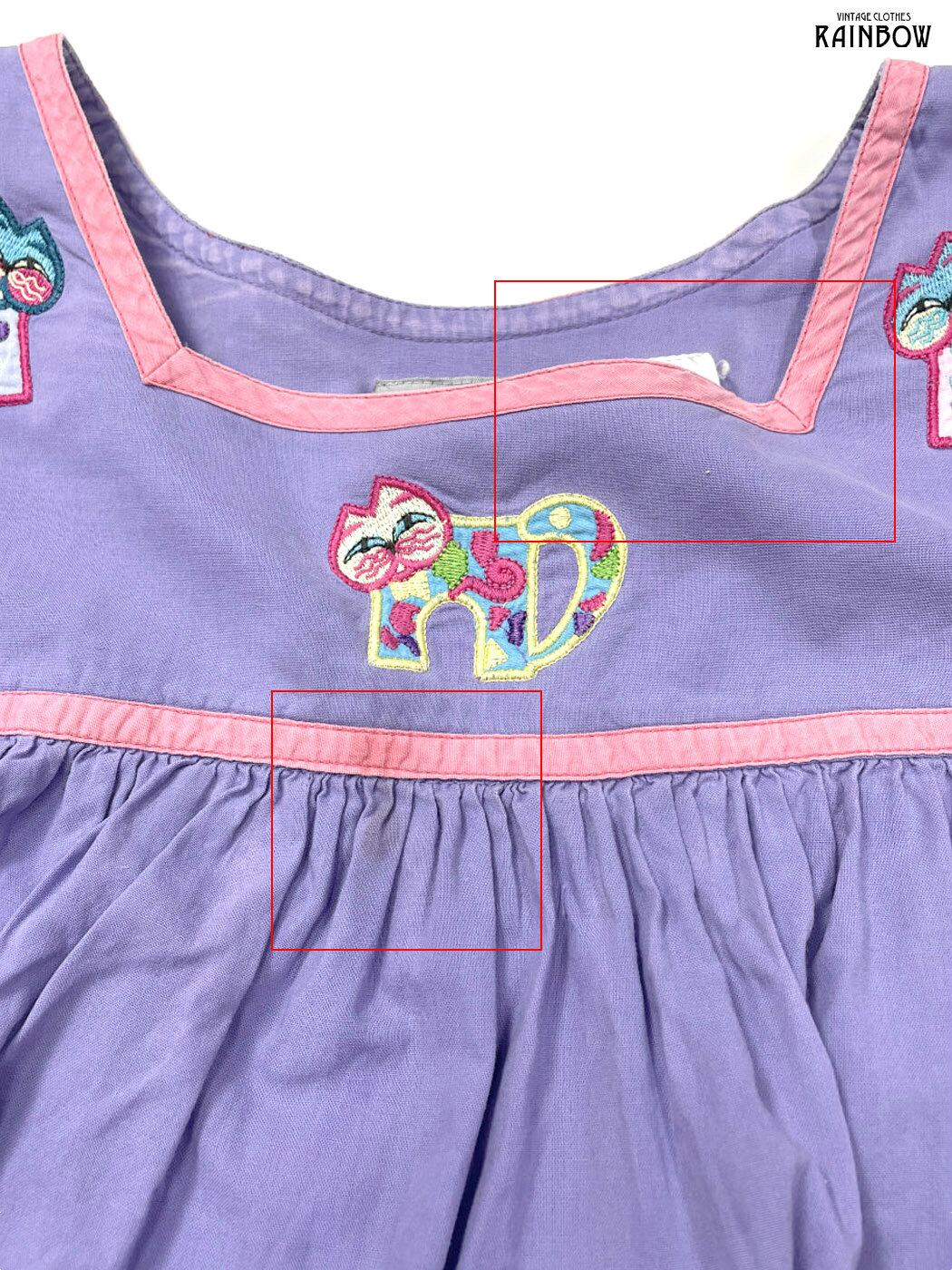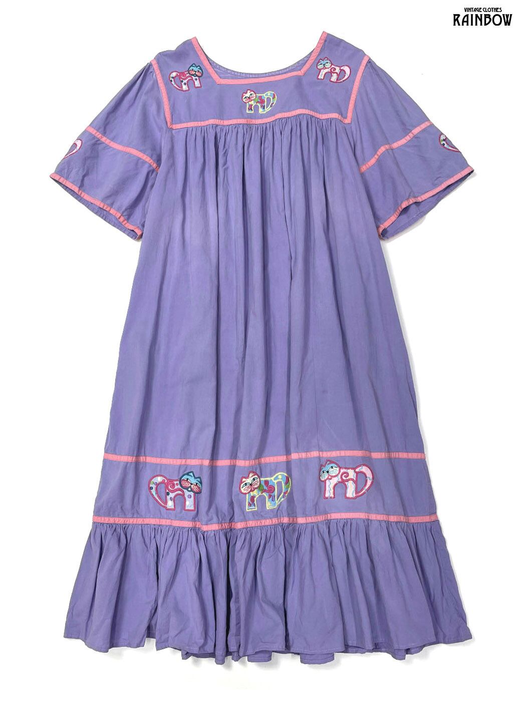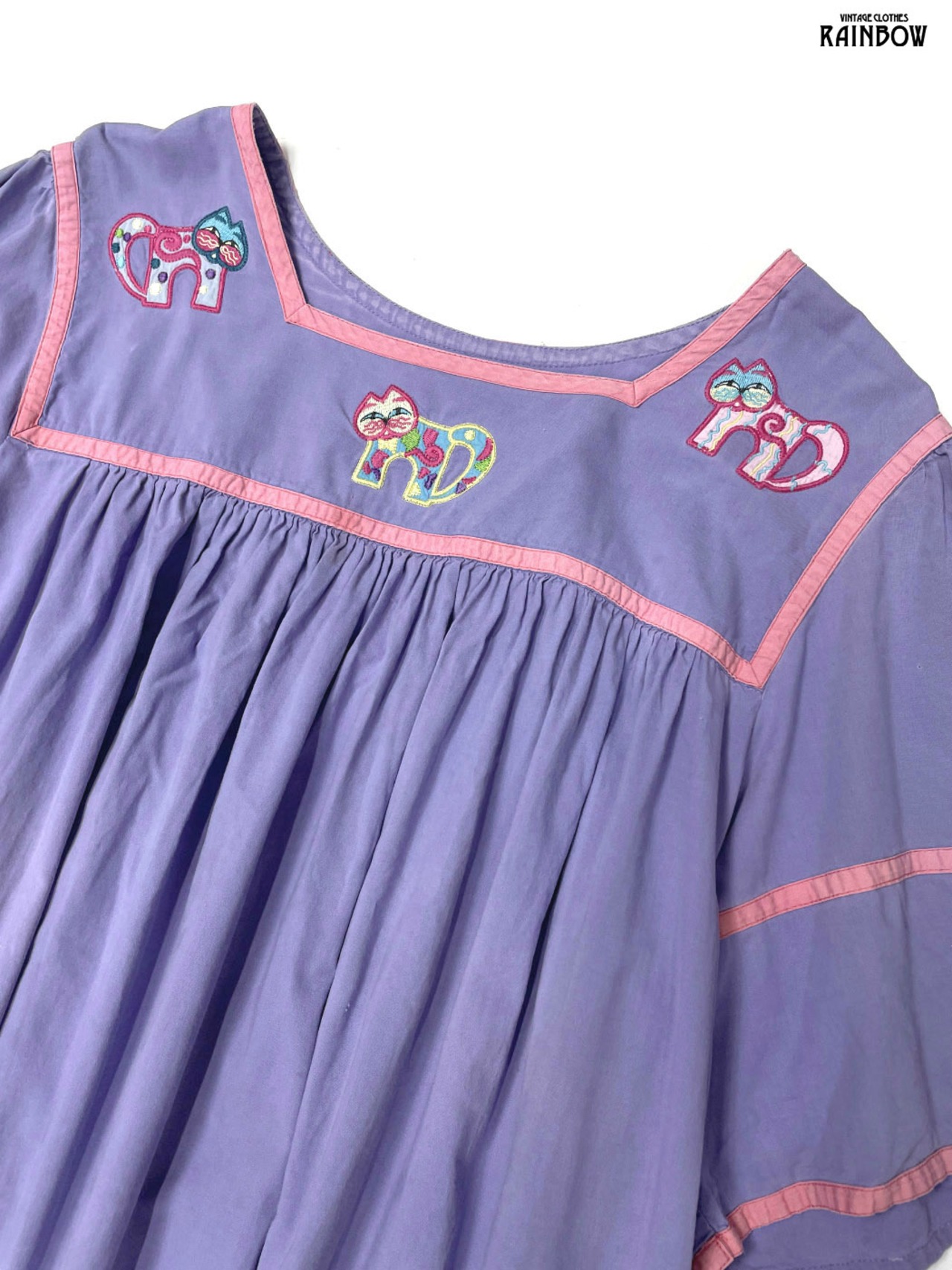#ワンピース #ハーフスリーブ #ロング丈 #ティアード #Aライン #紫 #無地 #猫 #アップリケ #刺繍 #ヴィンテージ #コットン #刺繍ワンピース