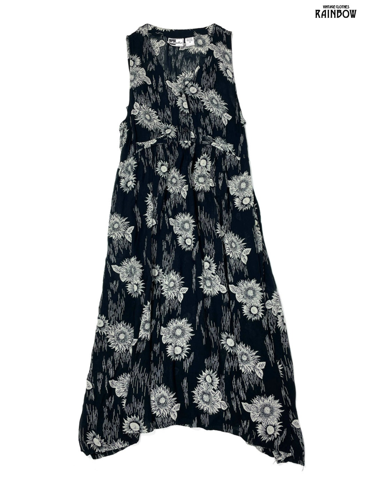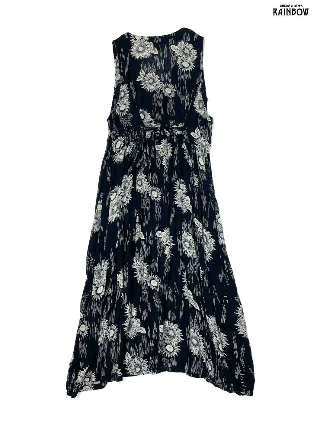 #ワンピース #ノースリーブ #ロング丈 #ウエスト切り替え #黒 #花柄 #シワ加工 #クラシック #レーヨン #ノースリーブ花柄ワンピース