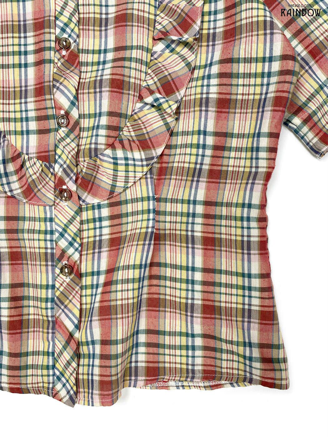 #ブラウス #シャツ #ハーフスリーブ #赤 #ベージュ #チェック柄 #フリル #前開き #ハイネック #ガーリー #コットン #チェック柄シャツ